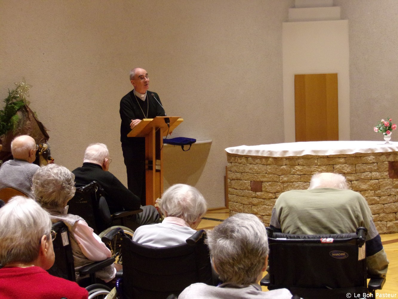 Le 12 janvier 2023 : Mgr Percerou est venu présenter ses vœux aux résidents de la maison du Bon Pasteur. Il a confié à leur prière le monde d’aujourd’hui avec ses bouleversements mondiaux causés par la guerre en Ukraine, avec les problèmes sociaux et économiques qui mettent à l’épreuve notre pays. Et il a longuement parlé de la vie de notre diocèse comparée à un kaléidoscope. En référence à sa lettre pastorale “Dans la joie que donne l’Esprit Saint”, il a fait part des chantiers engagés pour dynamiser la vie missionnaire de l’Eglise diocésaine. En sortant de la chapelle, tous ont partagés la galette des rois.