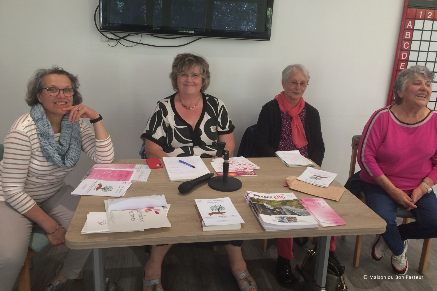 4 membres de l’Action Catholique des Femmes (A.C.F.) sont venues à la Maison du Bon Pasteur présenter la situation actuelle de leur mouvement dans le diocèse. Après une présentation de l’histoire du mouvement devenu A.C.F. en 2008, il a été question de la vie des équipes de base, où les membres s’accueillent, partagent leur vie concrète, s’entraidant avec bienveillance et en toute confidentialité pour mieux s’engager en vue de la promotion de la femme, tout en se laissant éclairer par la Parole de Dieu. Chaque année, l’échelon national propose un thème de réflexion qui a des retombées locales, comme l’écologie et l’Eglise verte. L’A.C.F. est aussi très partie prenante pour la journée mondiale de la prière.