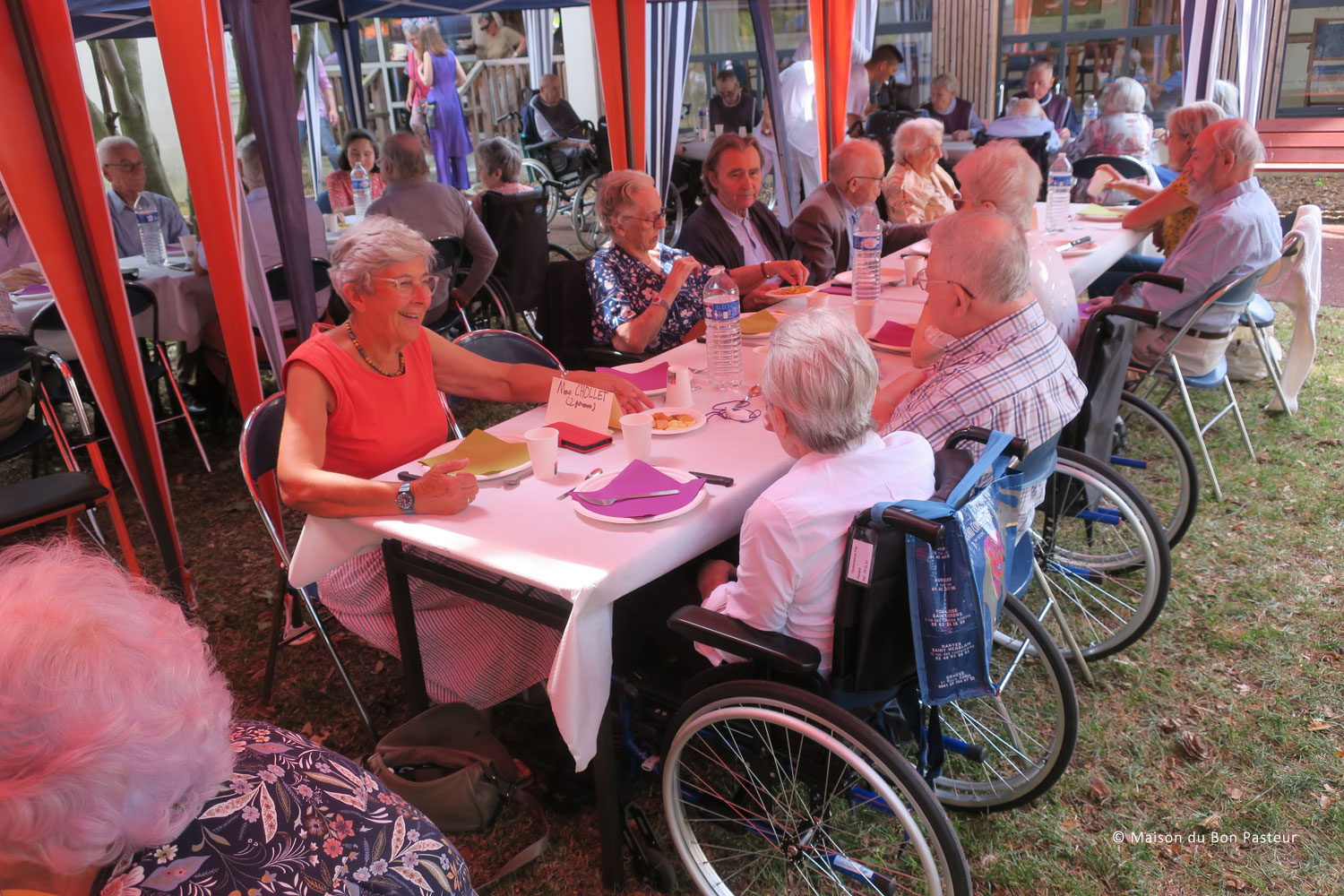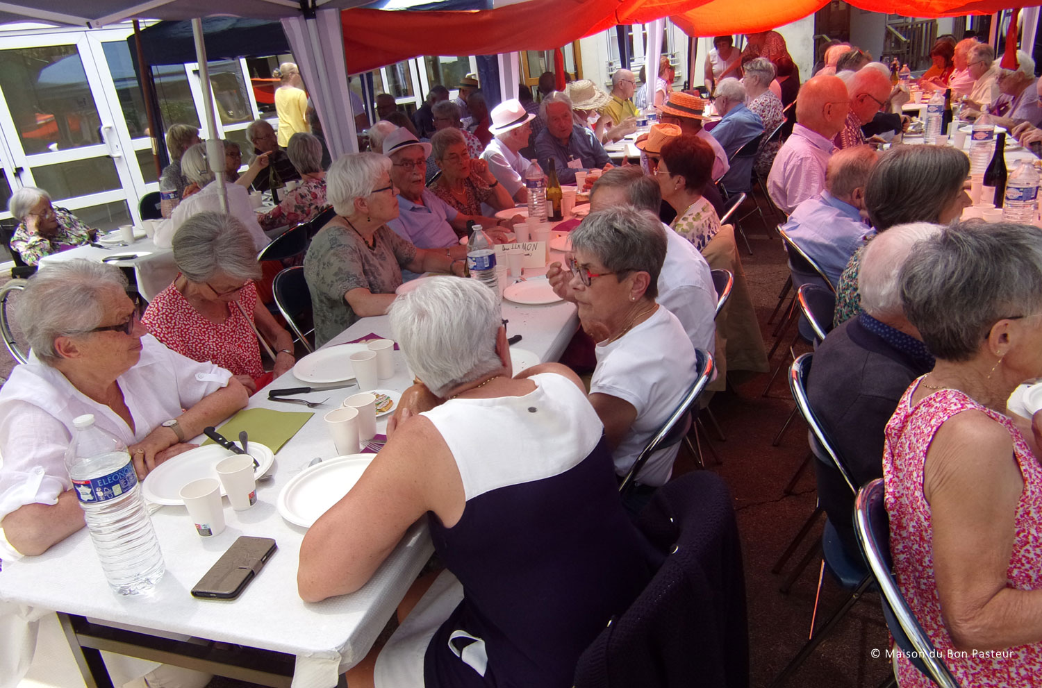 Évènement important de l’année dans la vie de la Maison du Bon Pasteur, le déjeuner grillades a rassemblé résidents, familles, amis, membres du Conseil d’Administration et bénévoles lors d’une belle journée ensoleillée. Après une messe à la chapelle, le personnel a accueilli les convives pour les conduire aux tables installées dans le parc et protégées du soleil par des barnums. Cela faisait 4 ans que nous n’avions pu faire le repas dehors à cause du covid-19 et de la météo. Le repas fut très apprécié et le moment enjoué et chaleureux.