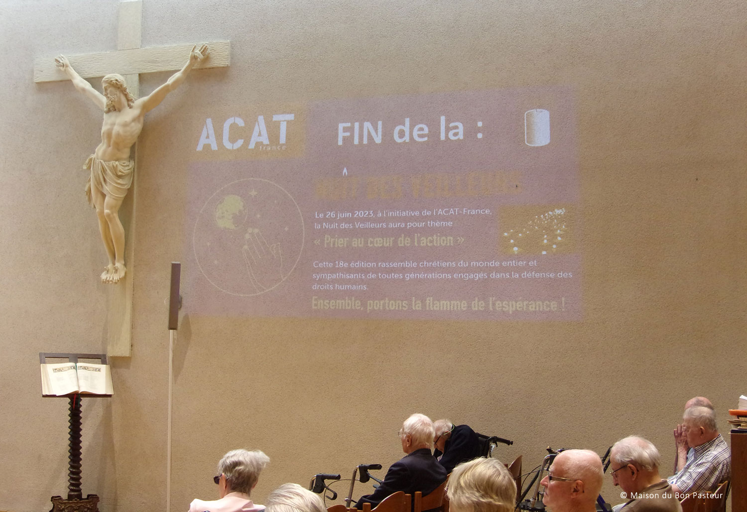 Dans la chapelle de la Maison du Bon Pasteur, cette veillée de prière pour les victimes de la torture était animée par l’équipe de Nantes de l’A.C.A.T (Action des Chrétiens pour l’Abolition de la Torture). Cette veillée était d’une grande qualité avec la présentation de la situation de 9 victimes, suivie d’un temps de prière pour eux et rythmée par le chant “Viennent les cieux nouveaux et la nouvelle terre que Dieu nous donnera et où la justice habitera”.