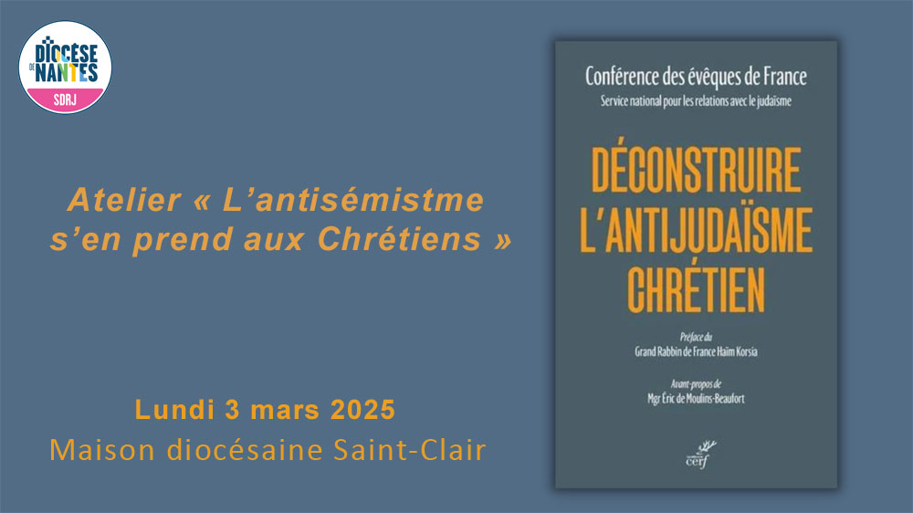 Faisant suite à la soirée d’accueil de la Communauté juive par Mgr Percerou, le 28 novembre 2024, l’équipe du SDRJ animera un atelier d’échanges le lundi 3 mars 2025, de 18h30 à 20h, à la Maison St Clair sur le thème « L’antisémitisme s’en prend aux Chrétiens » à partir de la Déclaration du 1er février 2021 et de la Tribune du 27 janvier 2025 des Évêques de France