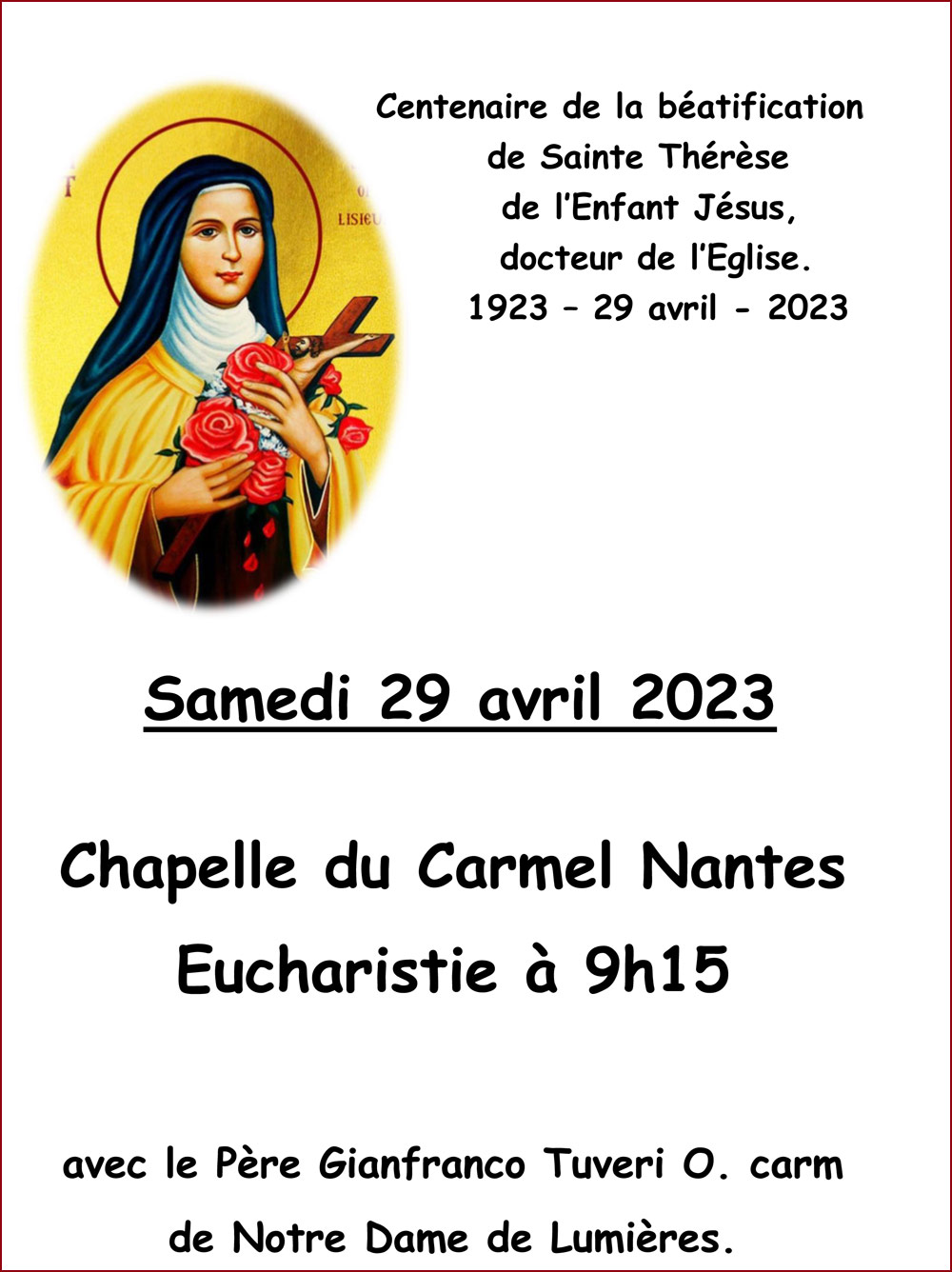 Samedi 29 avril 2023, le Carmel de Nantes fête le centenaire de la béatification de Sainte Thérèse de l’Enfant Jésus en la chapelle du Carmel, avec le père Gianfranco Tuveri O. Carm de Notre-Dame des Lumières.