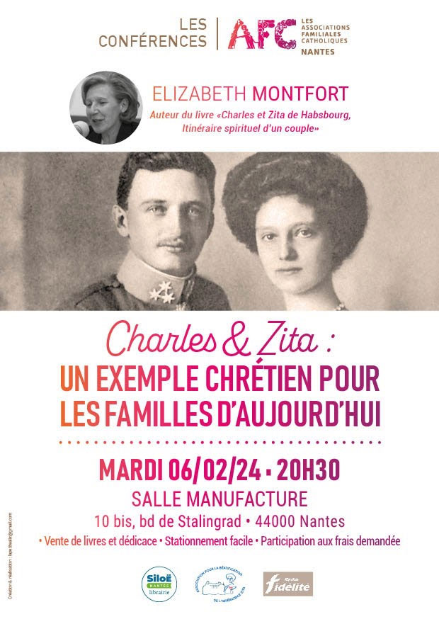 Les AFC de Nantes vous invitent à une conférence sur « Charles & Zita, un exemple chrétien pour les familles d’aujourd’hui » présentée par Élizabeth Montfort (Auteur et membre de l’association pour la béatification de l’impératrice Zita), le mardi 6 février 2024 à 20h30 à la salle Manufacture (10 bis bd de Stalingrad – 44000 Nantes).
