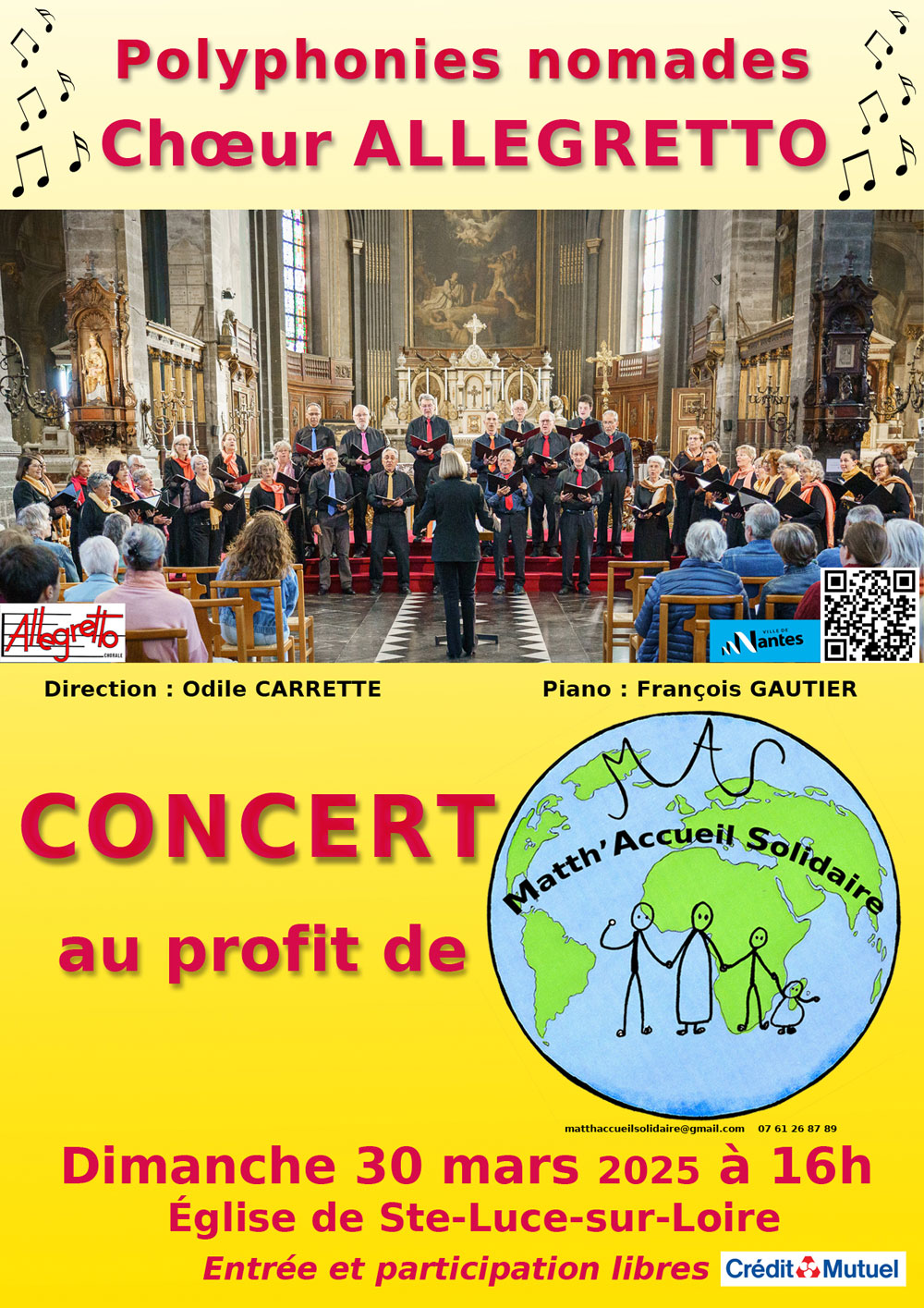 L’association Matth’Accueil Solidaire (association créée par des paroissiens de la paroisse Saint-Matthieu-sur-Loire qui vient en aide aux migrants) organise un concert avec le Chœur Allegretto le dimanche 30 mars 2025 à 16h en l’église de Sainte-Luce-sur-Loire.