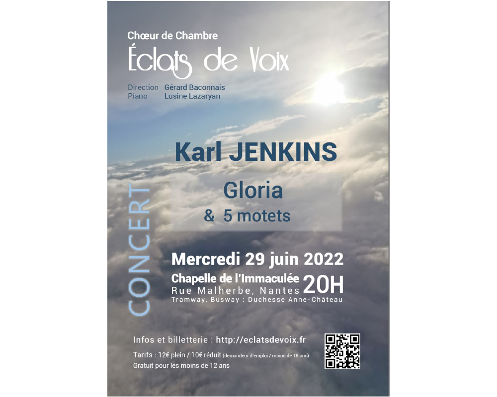 Mercredi 29 juin 2022 à 20h à la Chapelle de l’Immaculée de Nantes, le Chœur de Chambre Éclats de Voix, sous la direction de Gérard Baconnais, proposera un programme exclusivement consacré à Karl Jenkins, compositeur gallois né en 1944.