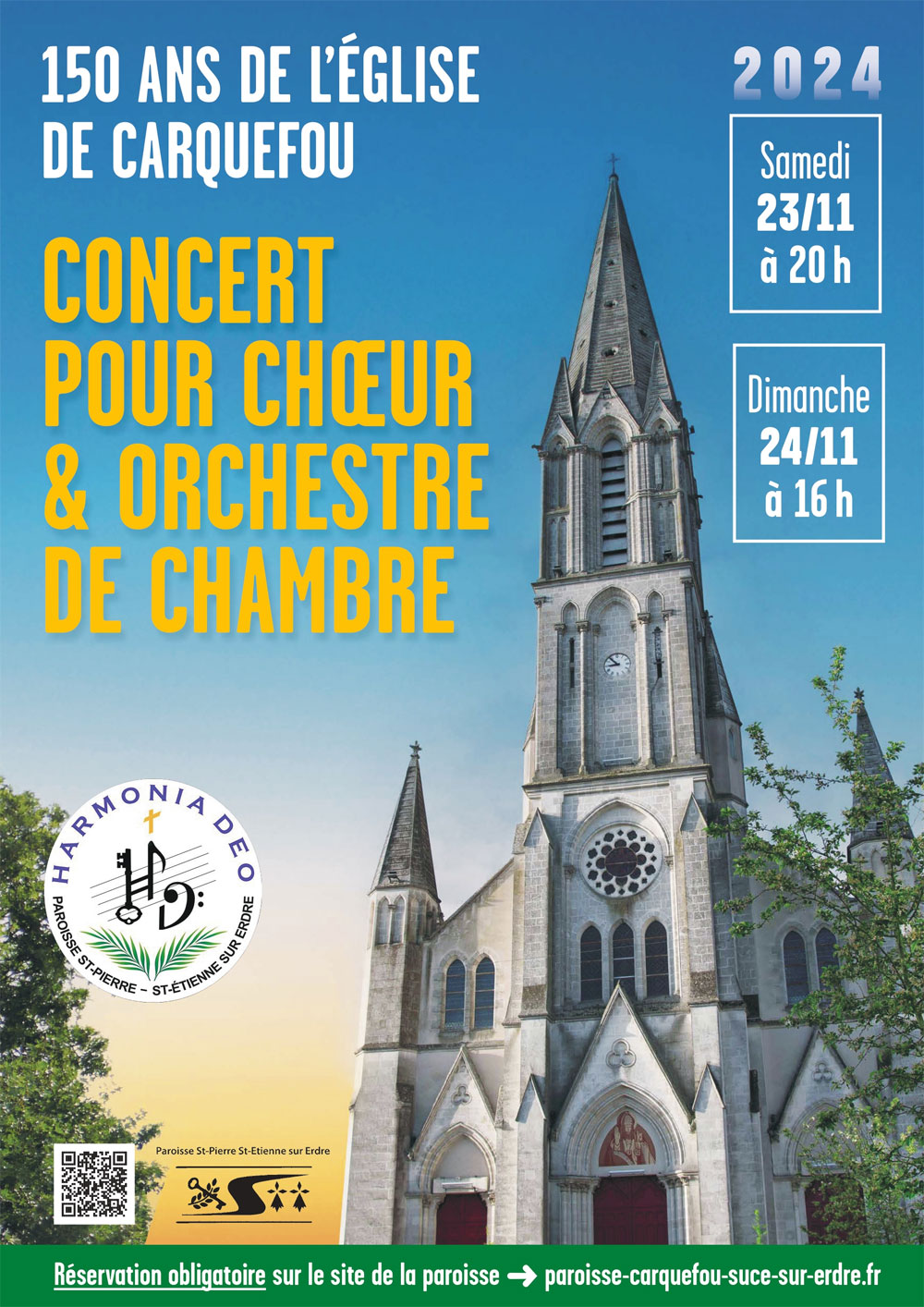 Dans le cadre de l’anniversaire des 150 ans de l’église de Carquefou, la chorale de la paroisse Saint-Pierre-et-Saint-Etienne-sur-Erdre « Harmonia Deo » se produira les samedi 23 et dimanche 24 novembre dans l’église. La première partie du concert sera consacrée au répertoire sacré pour chœurs et orchestre ainsi que des gospels. La deuxième partie sera dédiée à la création d’un oratorio composé pour l’occasion.