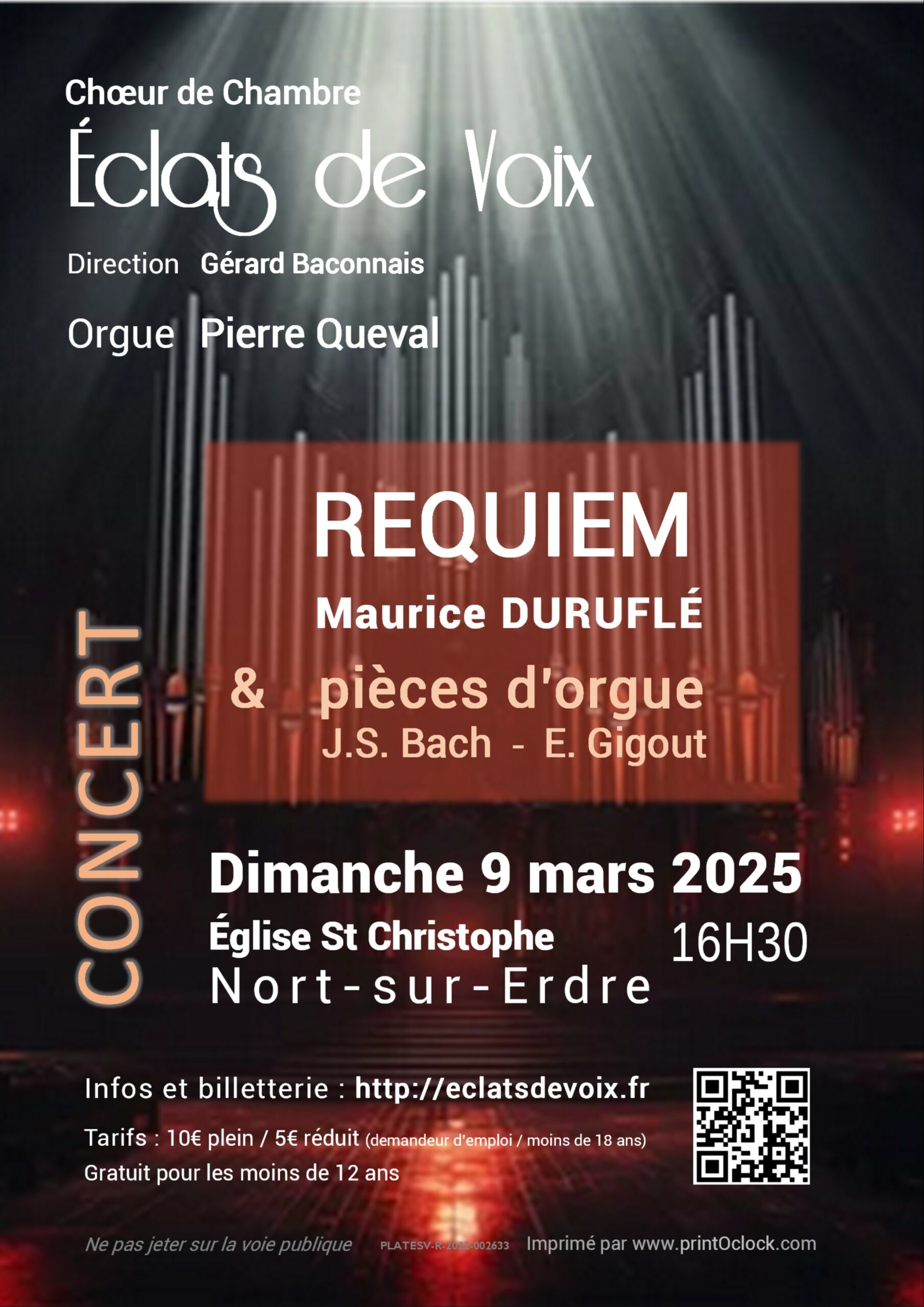 Le Chœur de Chambre Éclats de Voix dirigé par Gérard Baconnais vous propose un concert autour de Maurice Duruflé, le dimanche 9 mars à 16h30 en l’église Saint-Christophe de Nort-sur-Erdre (paroisse Saint-Martin-du-Val-d’Erdre).