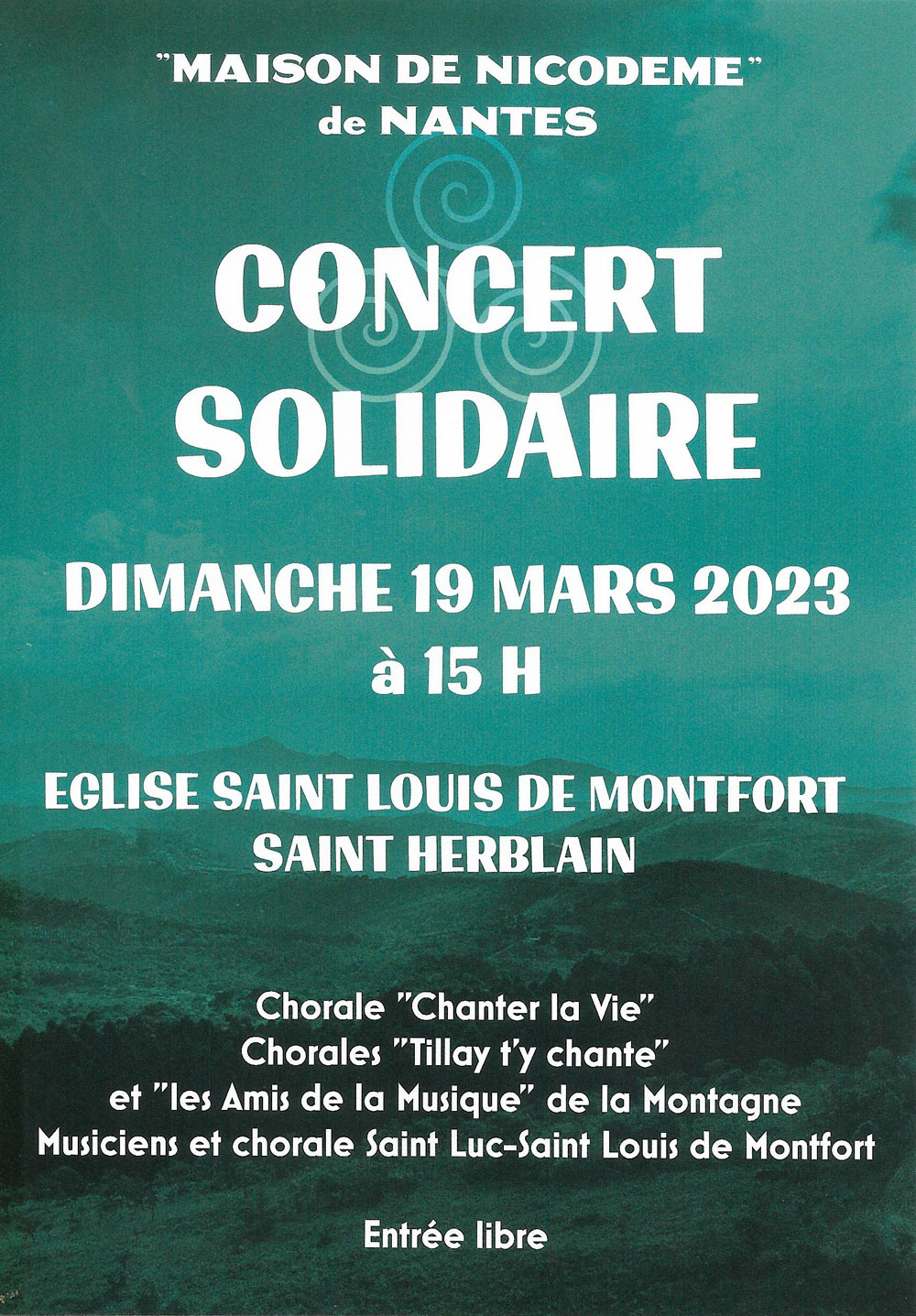 La chorale Saint Luc-Saint Louis de Montfort organise le dimanche 19 mars 2023 à 15h, en l’église Saint-Louis-de-Montfort à Saint-Herblain (paroisse Saint-Luc-Saint-Louis-de-Montfort), un concert de chant choral en solidarité avec l’association « La Maison de Nicodème » de Nantes qui gère une maison de soins palliatifs et d’accompagnement des personnes en fin de vie et de leurs proches.