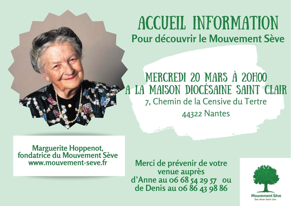 Rencontre d’accueil et d’information pour découvrir le Mouvement Sève, mercredi 20 mars 2024 à 20h à la Maison Diocésaine Saint Clair (7, chemin de la Censive du Tertre 44322 Nantes).