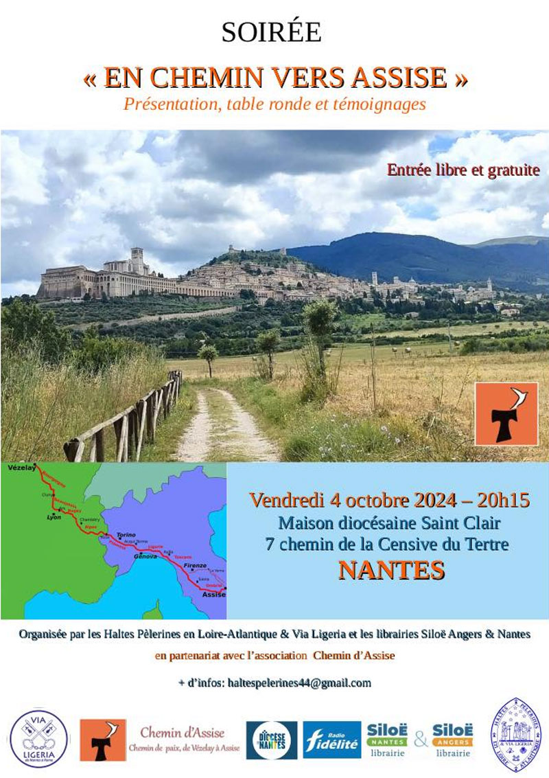 L’association Haltes pèlerines en Loire-Atlantique et Via Ligeria et les librairies Siloë Angers & Nantes, en partenariat avec l’association Chemin d’Assise organisent une soirée avec pour thème « En chemin vers Assise » le vendredi 4 octobre 2024 à 20h15 à la Maison diocésaine Saint-Clair.