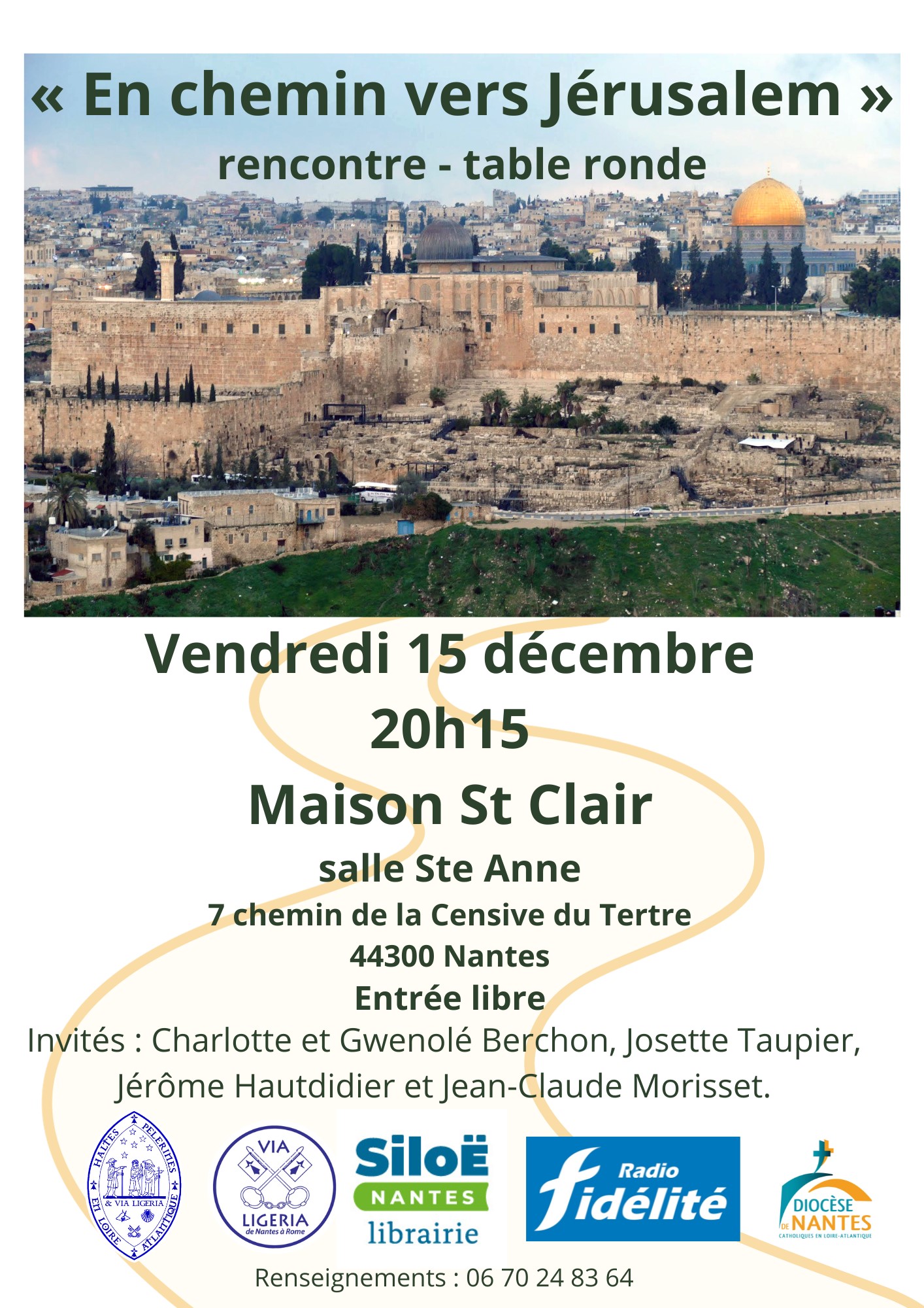 Vendredi 15 décembre 2023 à 20h15, l’association Haltes Pèlerines en Loire-Atlantique & Via Ligeria, en partenariat avec la librairie Siloë, Radio Fidélité et le Diocèse de Nantes, vous propose une rencontre – table ronde « En chemin vers Jérusalem » à la Maison Diocésaine Saint Clair (7 chemin de la Censive du Tertre à Nantes).