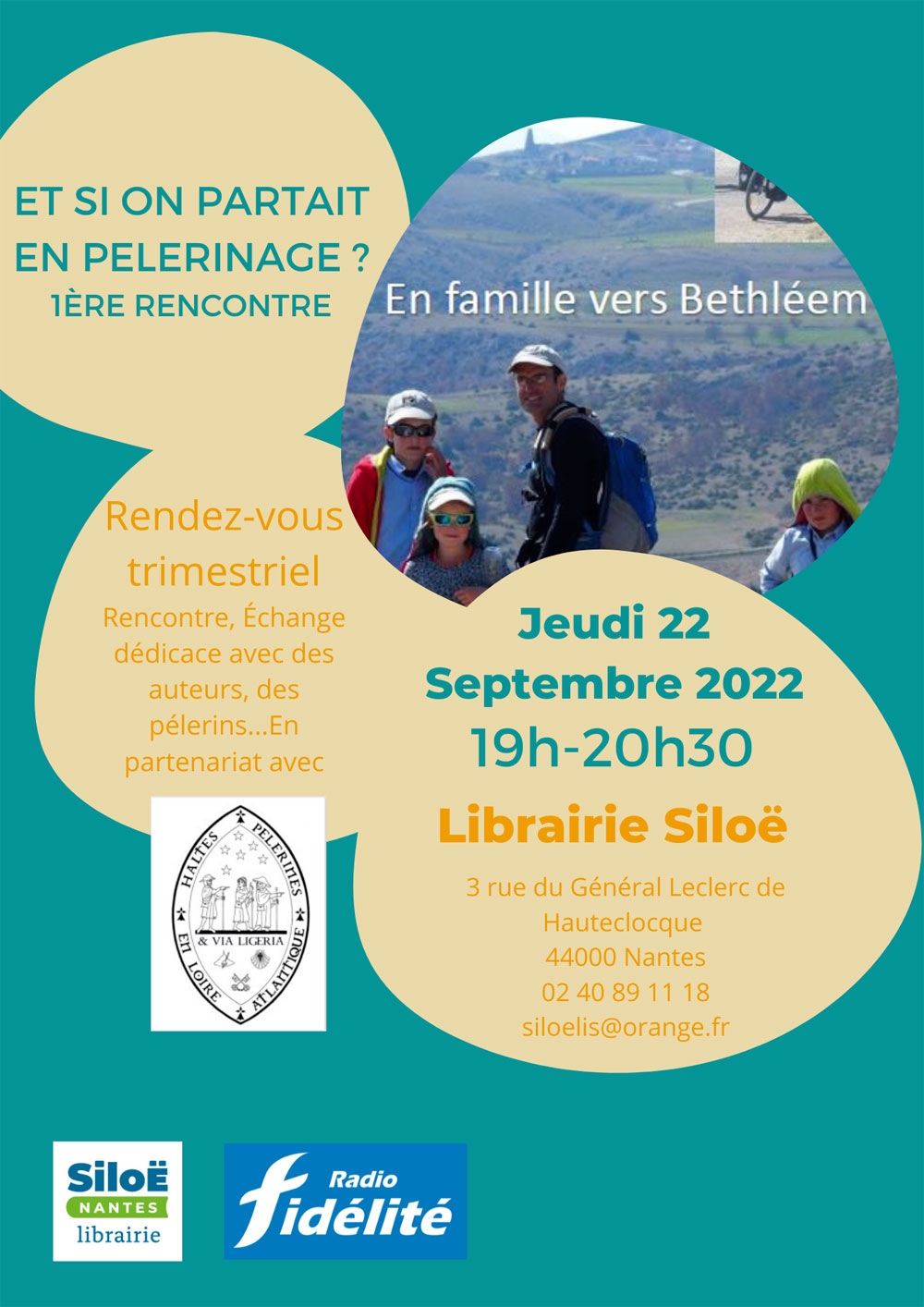 Chaque trimestre, la Librairie Siloë, en partenariat avec l’association Haltes Pèlerines en Loire-Atlantique et Radio-Fidélité, propose des rencontres, des échanges avec des auteurs, des pèlerins.