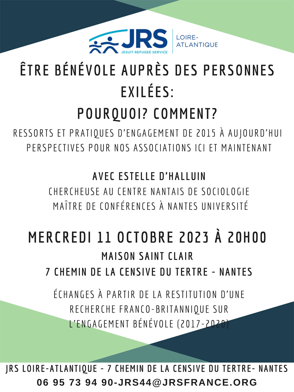 Mercredi 11 octobre 2023 à 20h à, la Maison diocésaine Saint-Clair, Jrs Loire-Atlantique propose une soirée d’échanges avec pour thème « Être bénévole auprès des personnes exilées : pourquoi ? comment ? » avec la présence d’Estelle d’Halluin, chercheuse au Centre nantais de Sociologie, maître de conférence à Nantes Université.
