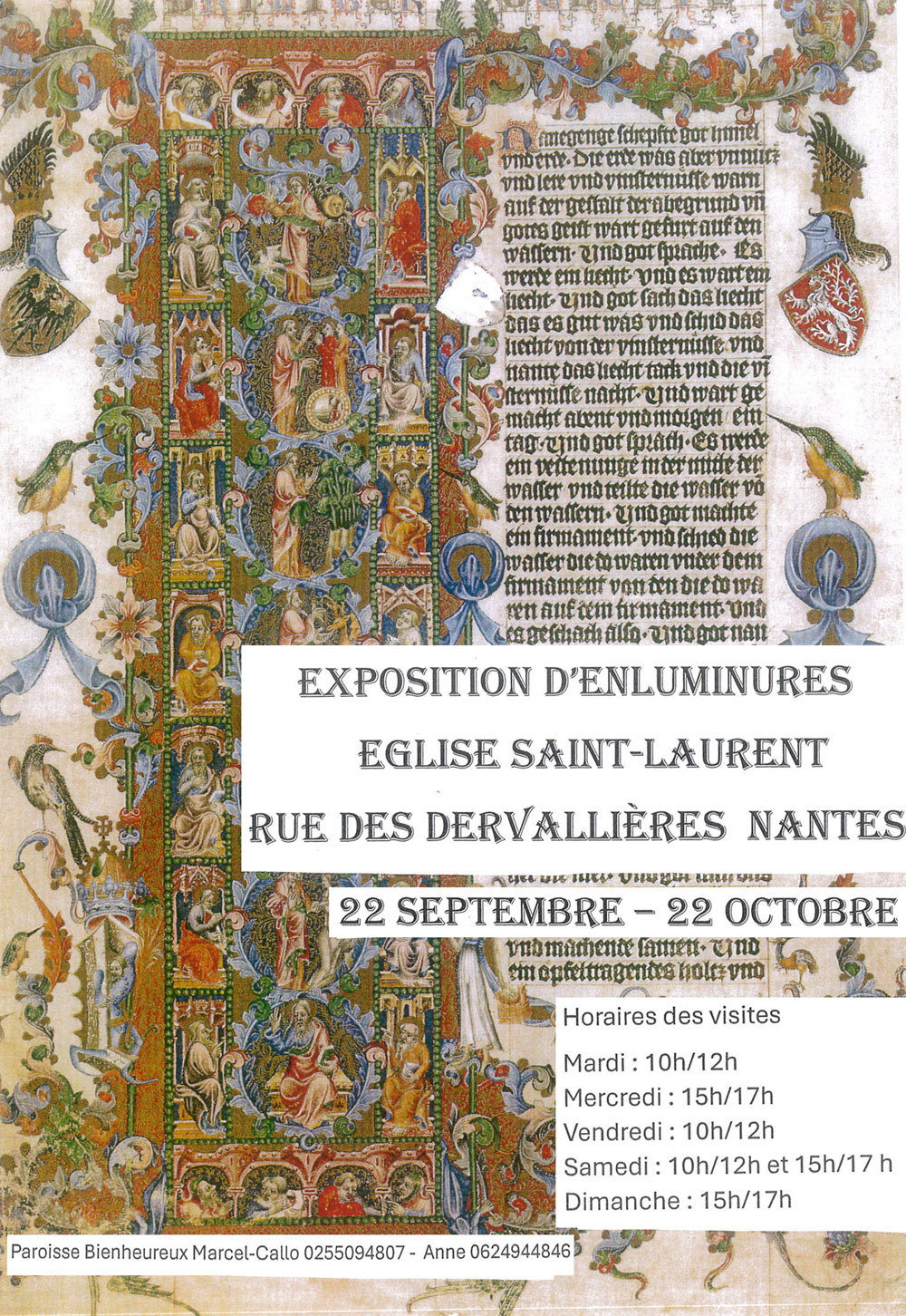 Du 22 septembre au 22 octobre 2024, ce sont une cinquantaine de pages enluminées qui sont présentées dans l’église de Saint-Laurent aux Dervallières en la paroisse Bienheureux-Marcel-Callo.