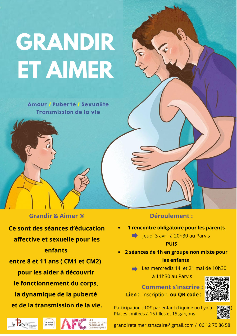 Les Associations Familiales Catholiques (AFC) vous proposent une formation « Grandir et Aimer » au Parvis de Saint-Nazaire sous forme de trois séances en avril et mai :