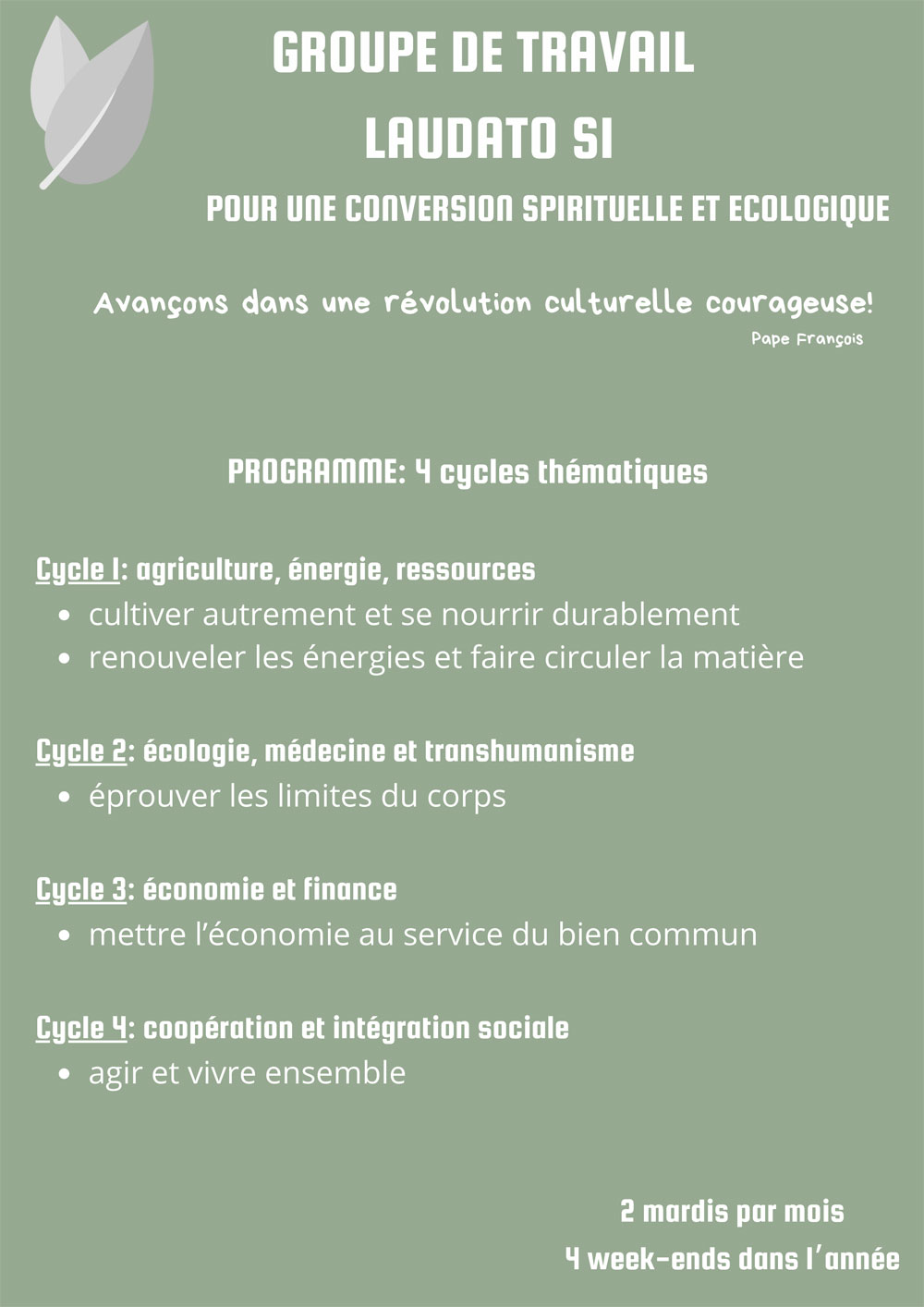 Le nouveau Groupe de Travail Laudato Si à la paroisse Notre-Dame-de-Nantes propose à celle-ci un parcours en 12 rencontres (8 mardis soirs, 4 WE sur l’année), pour une conversion spirituelle et écologique, s’adressant aux jeunes actifs.