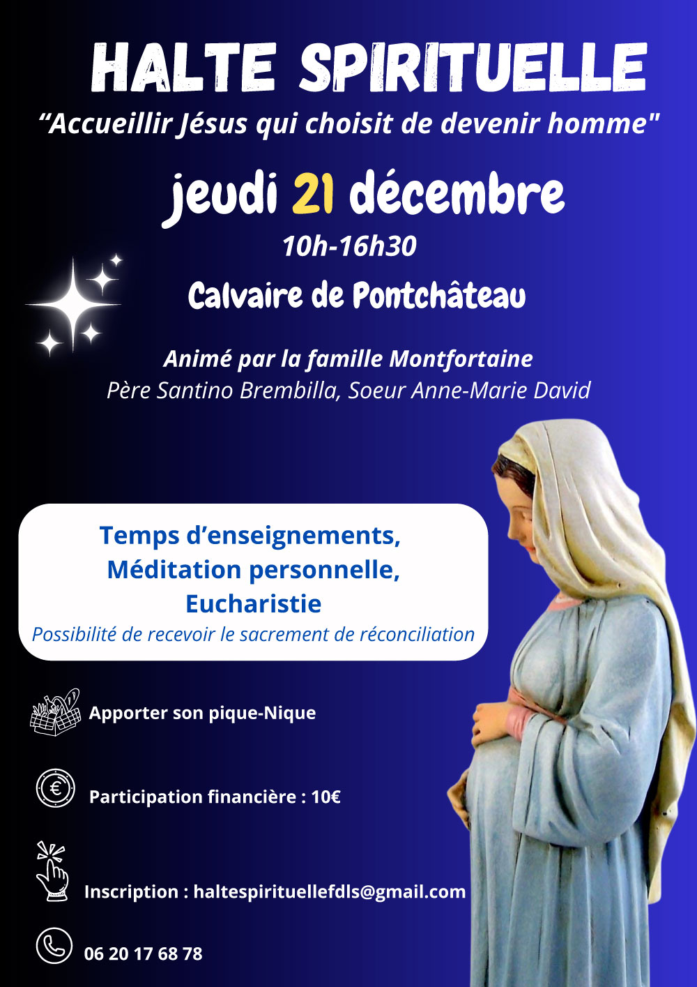 Durant le temps de l’Avent, la Famille Montfortaine propose une halte spirituelle au Calvaire de Pontchâteau le jeudi 21 décembre 2023 de 10h à 16h30.