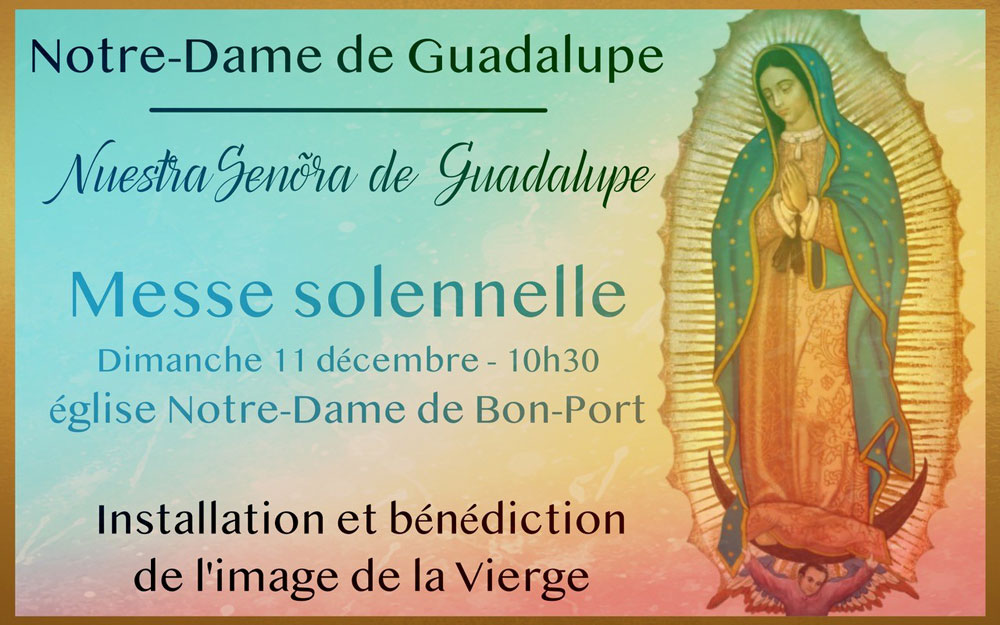L’église Notre-Dame de Bon-Port (paroisse Notre-Dame-de-Nantes) va accueillir durablement l’image de Notre-Dame de Guadalupe (venue directement du sanctuaire mexicain). Celle-ci sera bénie au cours de la messe du dimanche 11 décembre 2022 à 10h30, avec la participation de la communauté hispanique et hispanophone de Nantes.