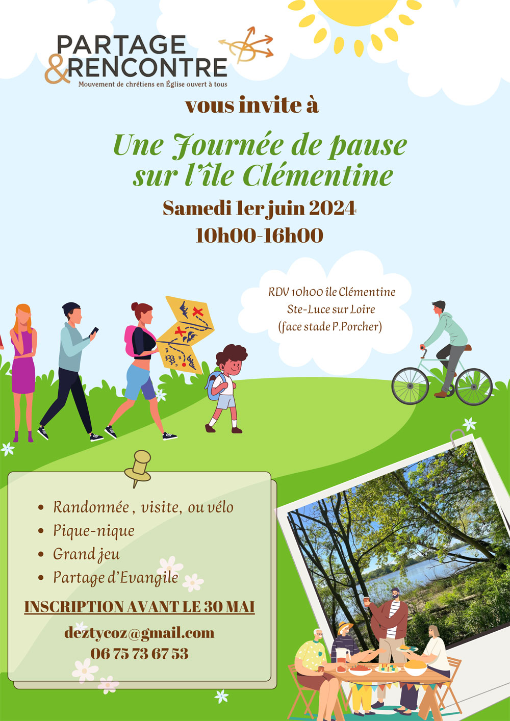 Le mouvement Partage et Rencontre vous propose une Journée de pause à l’île Clémentine (Sainte-Luce-sur-Loire) le samedi 1er juin 2024 de 10h à 16h
