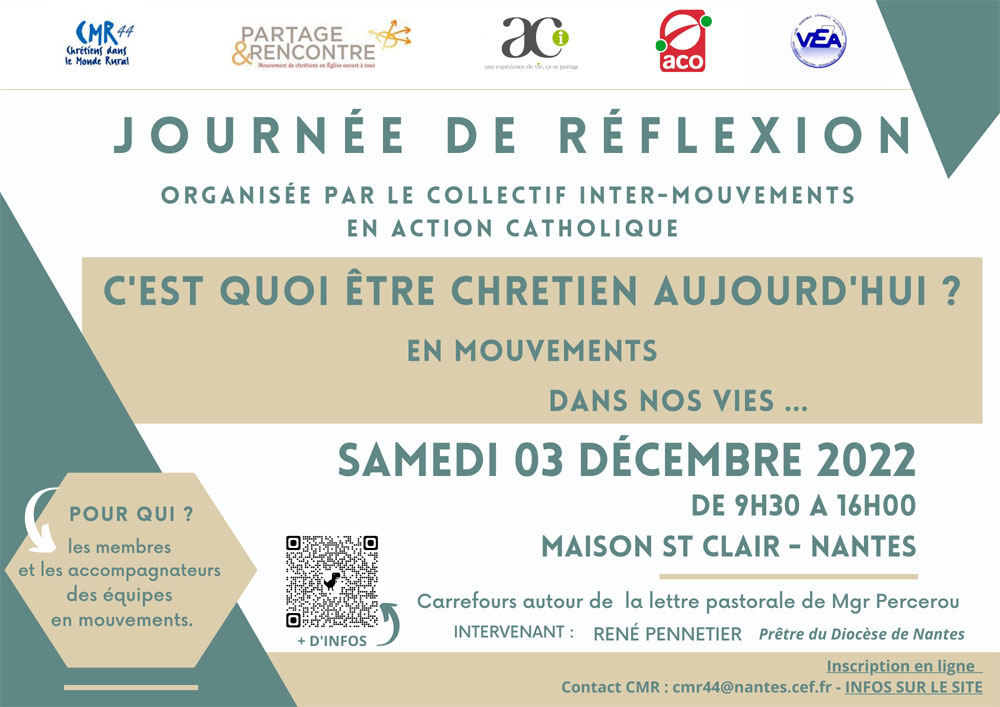 Le Collectif inter-Mouvements de formation en Action Catholique* organise une journée de réflexion le samedi 3 décembre 2022 de 9h30 à 16h00 à la Maison diocésaine Saint-Clair avec pour thème « C’est quoi être chrétien aujourd’hui ». Cette formation s’adresse aux accompagnateurs et aux membres des équipes en mouvements.