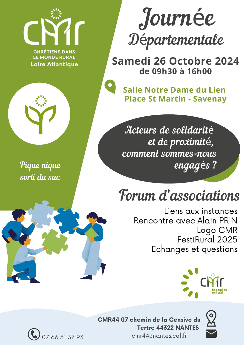 Le Mouvement Chrétiens en Monde Rural en Loire Atlantique (CMR44) organise sa Journée départementale le 26 octobre 2024 (de 9h30 à 16h) à la Salle Notre-Dame du Lien à Savenay (Place Saint Martin – 44260 Savenay).