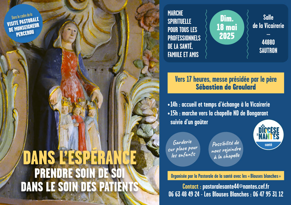 Dans le cadre de la visite pastorale de Mgr Percerou du monde de la santé et des services sociaux, la Pastorale de la santé avec les « Blouses blanches » organisent une marche spirituelle pour tous les professionnels de la santé, famille et amis le dimanche 18 mai 2025 à Sautron.
