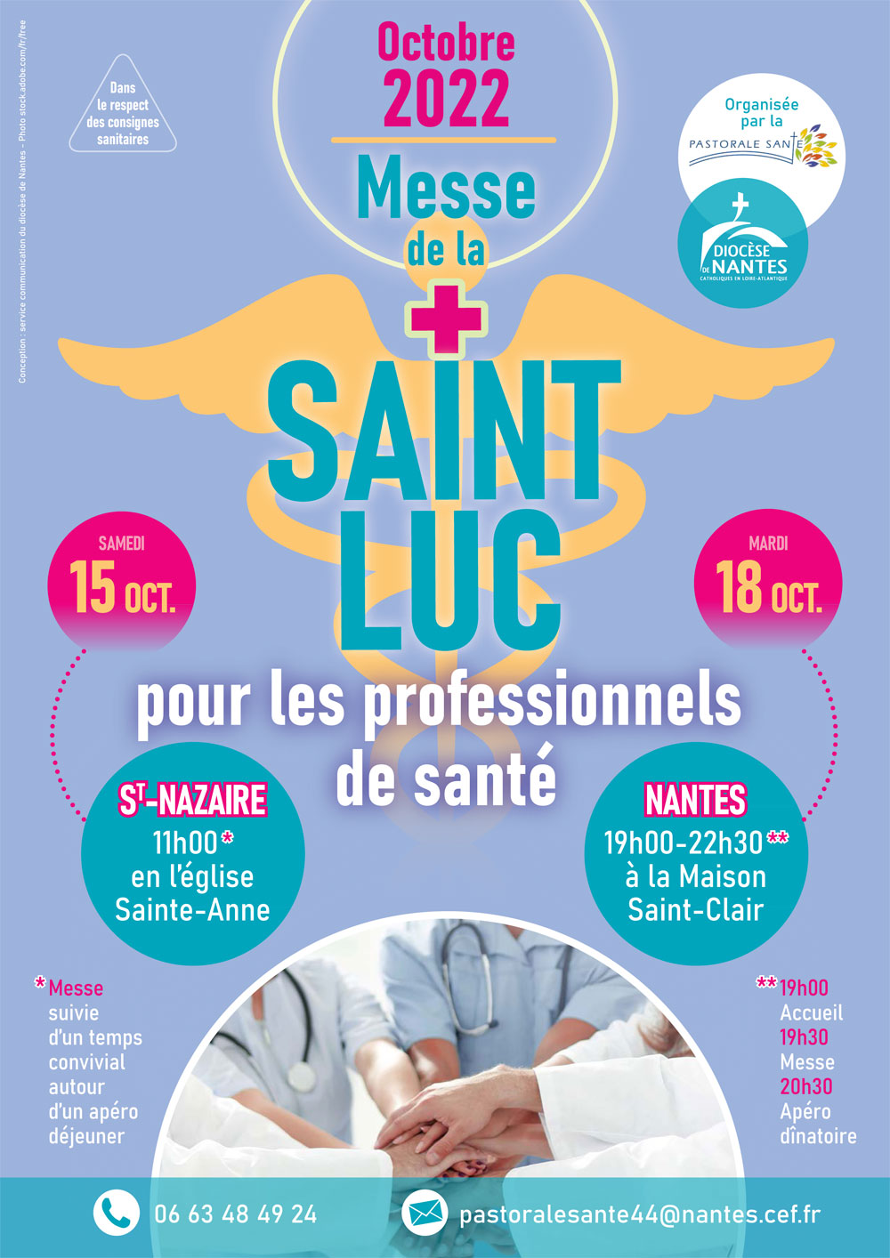 La Pastorale de la santé invite tous les professionnels de la santé à la Messe de la Saint Luc le samedi 15 octobre 2022 en l’église Sainte-Anne à Saint-Nazaire (28 boulevard Jean Mermoz), suivie d’un moment convivial.