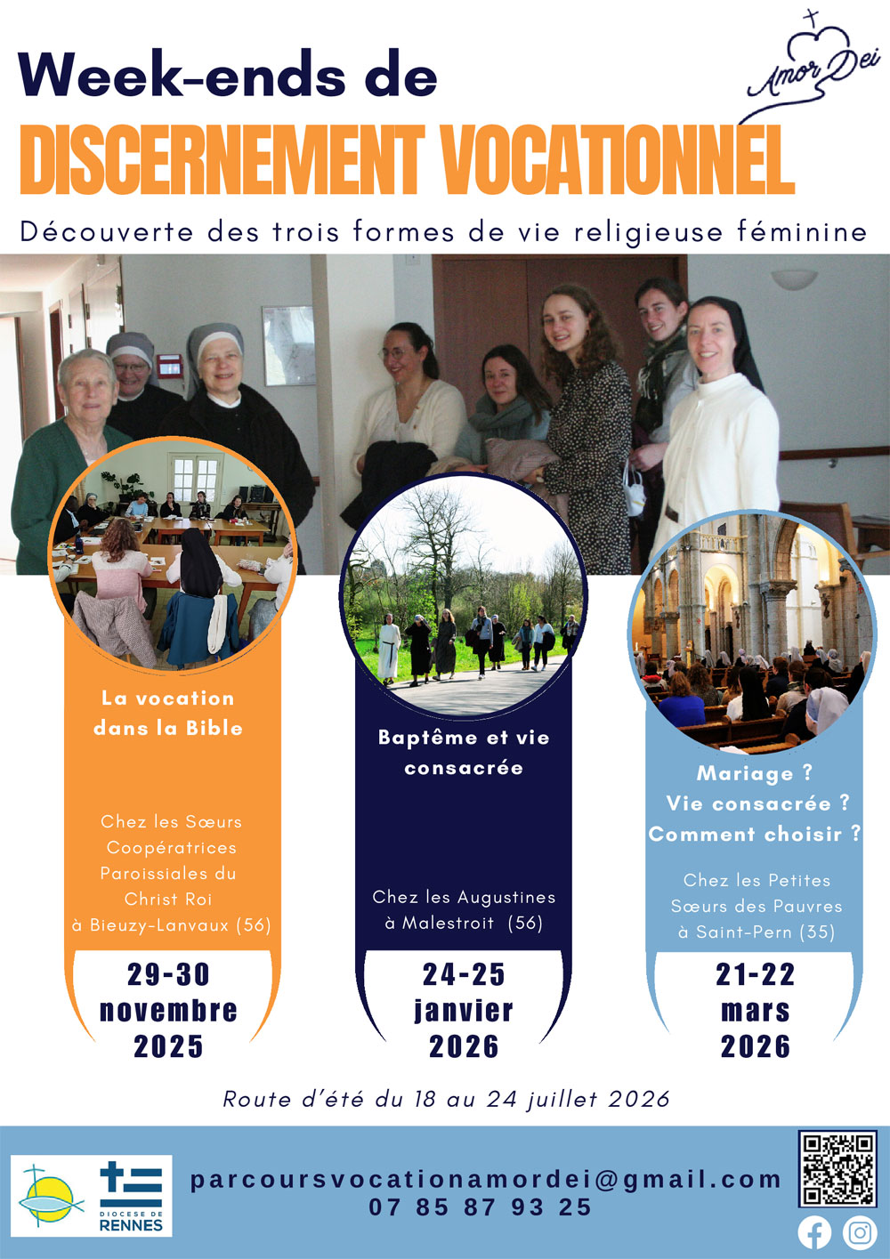 - Les 21-22 mars 2026, chez les Petites Sœurs des Pauvres, à Saint-Pern (35). Il sera animé par Mme Napoléoni sur le thème « Mariage, vie consacrée: quelle vocation pour moi ?«