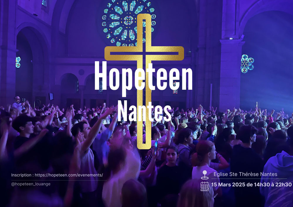 Hopeteen est de retour à Nantes le samedi 15 mars 2025 (de 14h30 à 22h30) en l’église Sainte-Thérèse de Nantes (paroisse Saint-Jean-Paul-II).