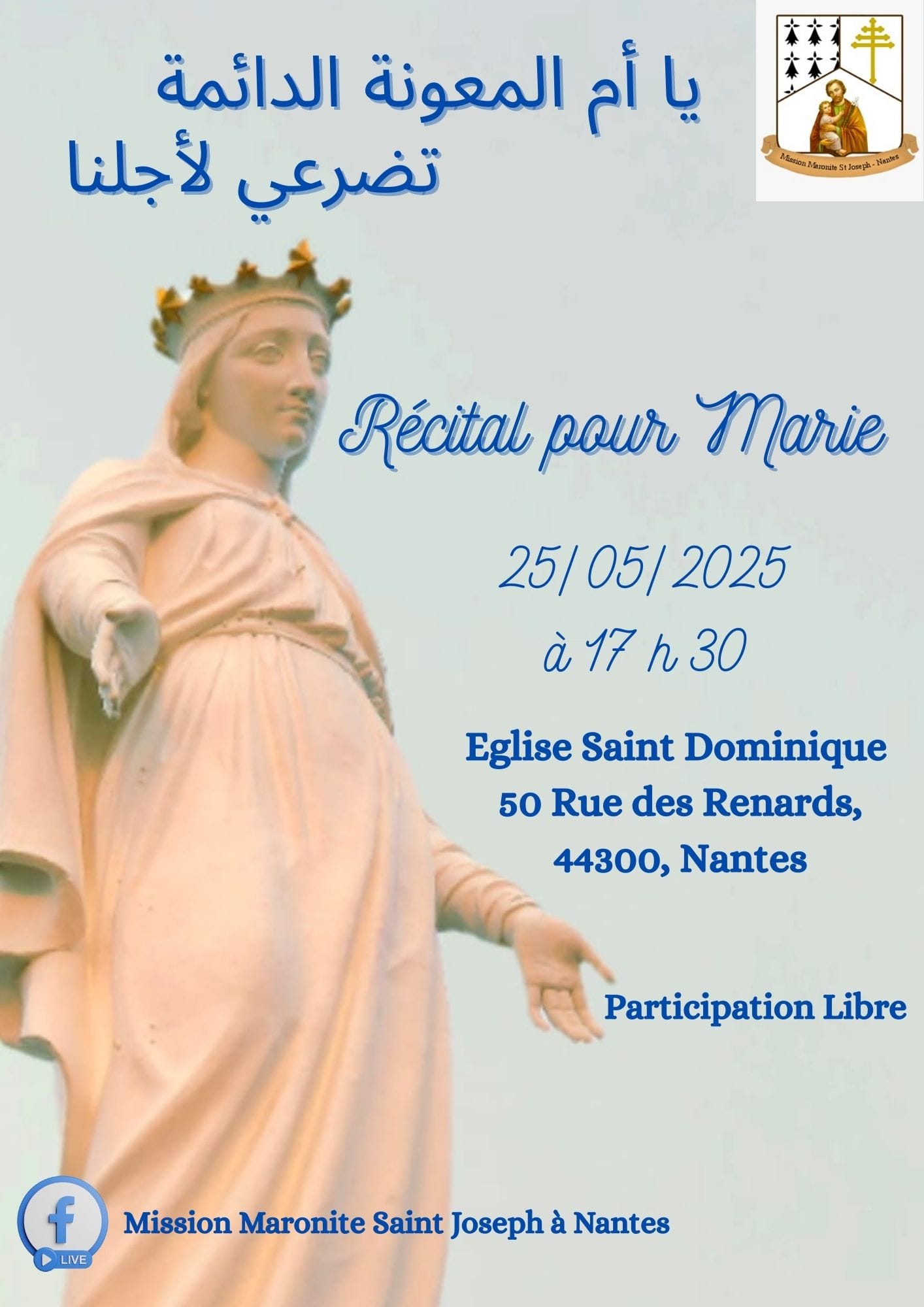 Nous vous invitons à un récital dédié à la Vierge Marie, en français, syriaque, grecque et arabe, selon les rites maronite, latin, et grecque catholique, une soirée de musique et de recueillement, ouverte à tous.