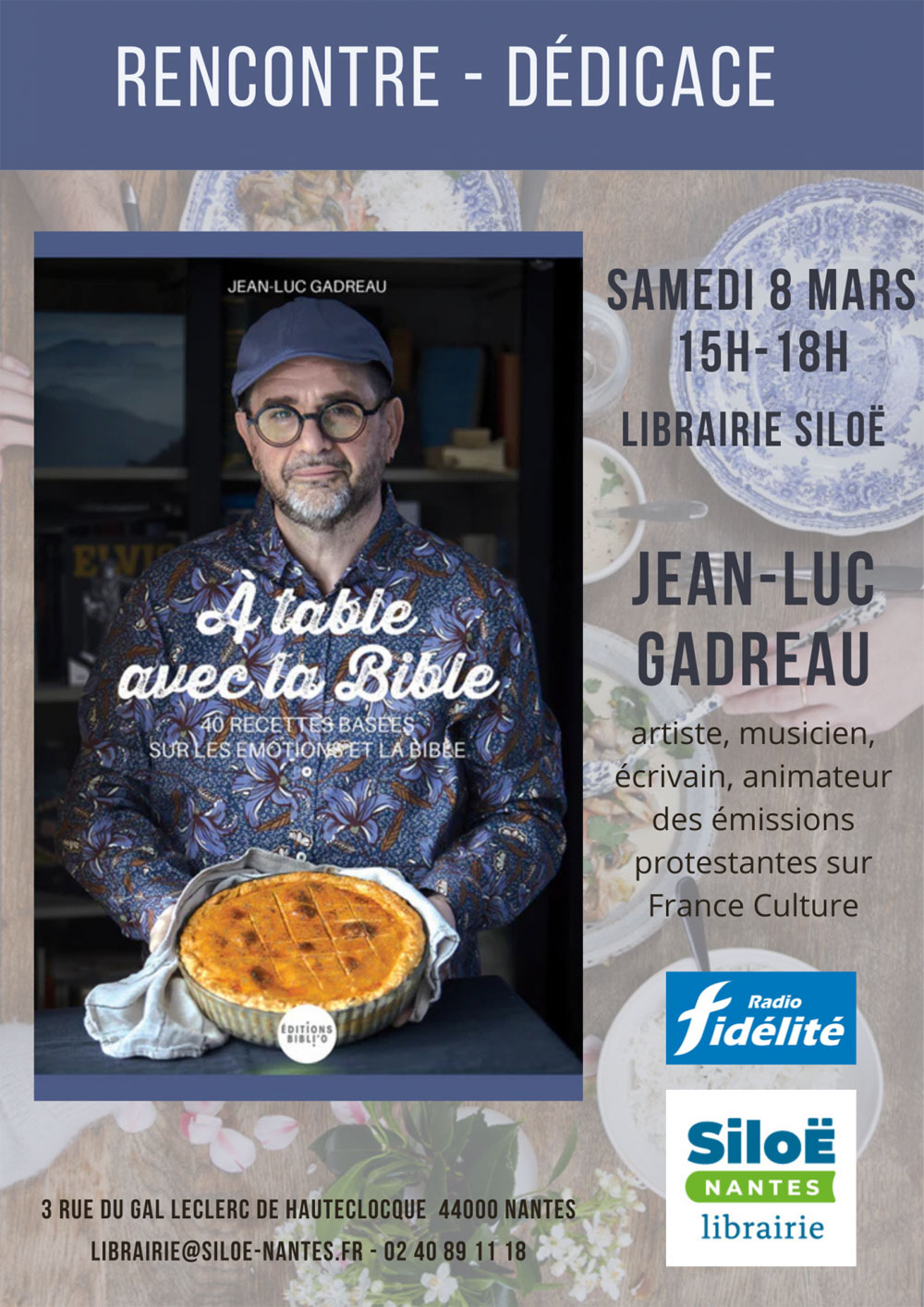 Rencontre-dédicace avec Jean-Luc Gadreau, le samedi 8 mars 2025 de 15h à 18h à la librairie Siloë (3 rue du général Leclerc de Hauteclocque à Nantes, près de la Cathédrale) auteur de « A table avec la Bible ».