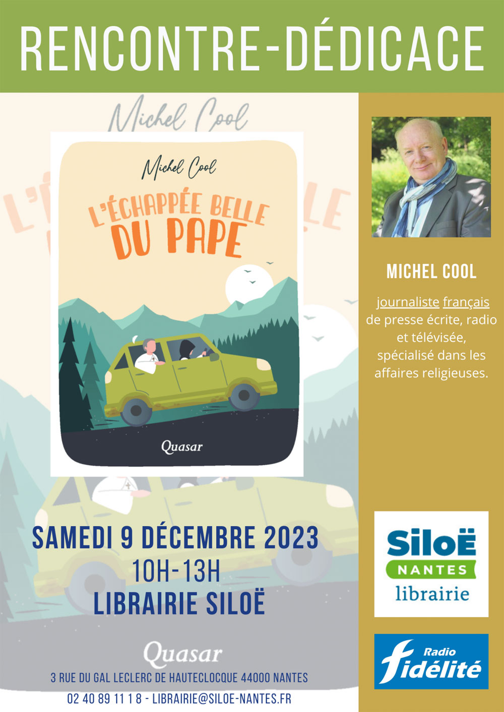 Rencontre-dédicace avec Michel Cool le 9 décembre 2023 de 10h à 13h à la librairie Siloë (3 rue du Gal Leclerc de Hauteclocque – 44000 Nantes). Michel Cool, journaliste français de presse écrite, radio et télévisée, spécialisé dans les affaires religieuses est l’auteur de « L’échappée belle du pape » paru en octobre 2023 aux éditions Quasar.