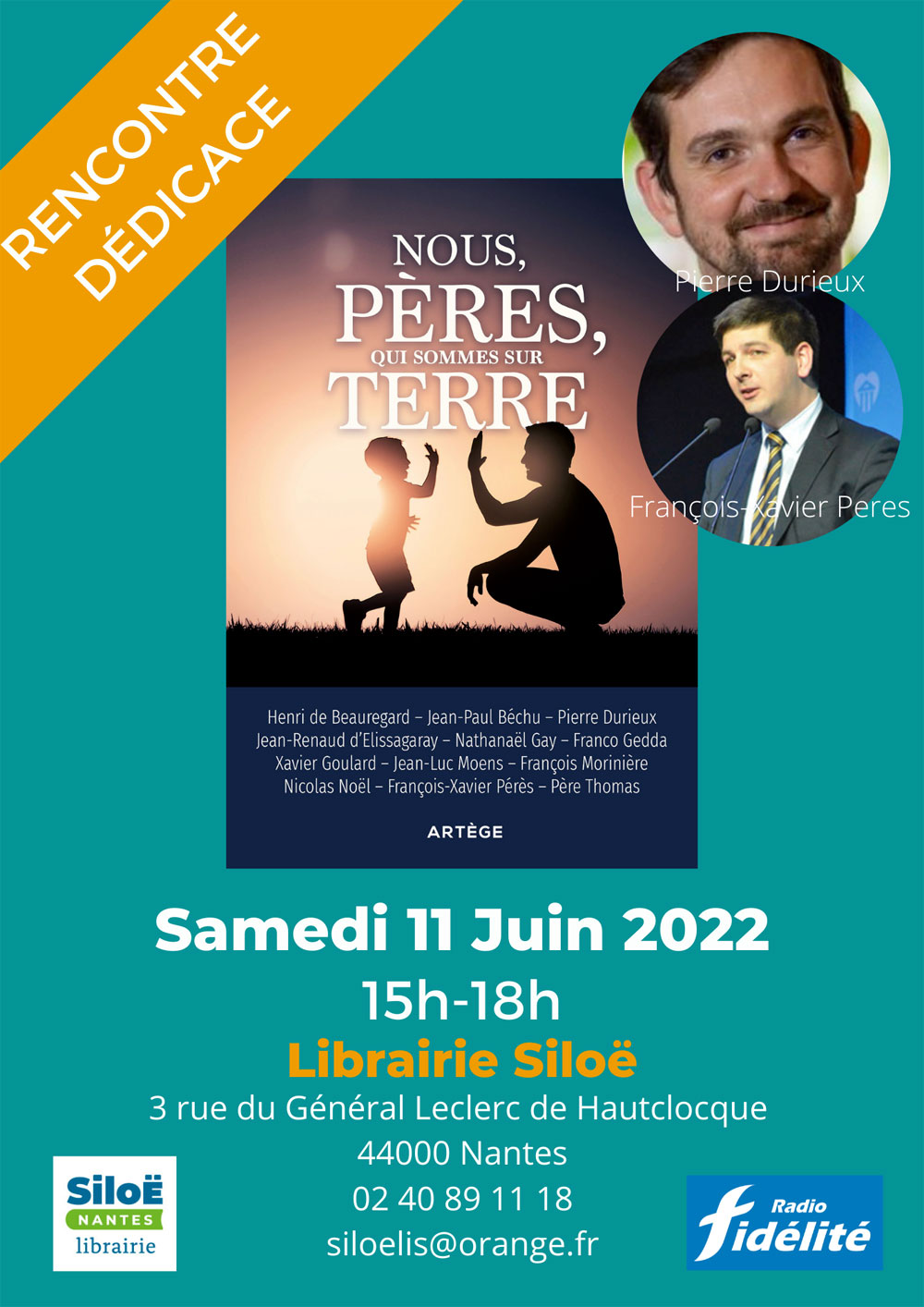 Rencontre dédicace avec Pierre Durieux et François-Xavier Peres, co-auteurs de « Nous, pères, qui sommes sur terre », le samedi 11 juin 2022 de 15h à 18h à la librairie Siloë (3 rue du général Leclerc de Hauteclocque à Nantes, près de la Cathédrale).