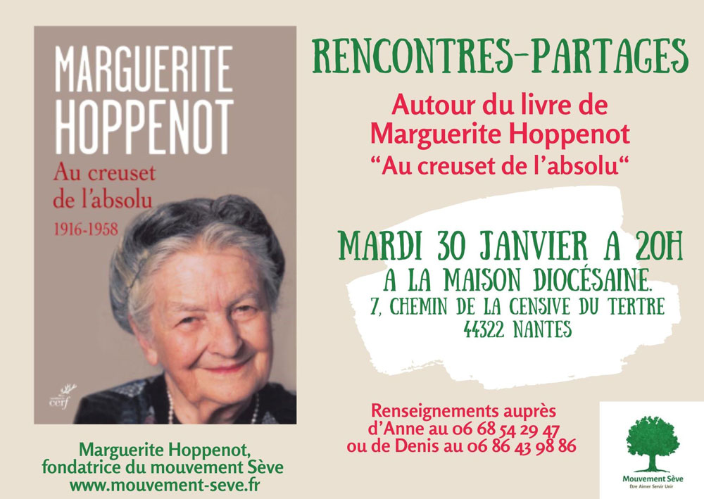 Le Mouvement Sève organise une soirée « Rencontres-partages autour d’un livre “Au creuset de l’absolu” » de Marguerite Hoppenot, fondatrice de ce mouvement. Une grande spirituelle qui traversa le XXème siècle et confirme l’authenticité d’une vue prophétique qui éclaire de toute sa lumière notre monde actuel.
