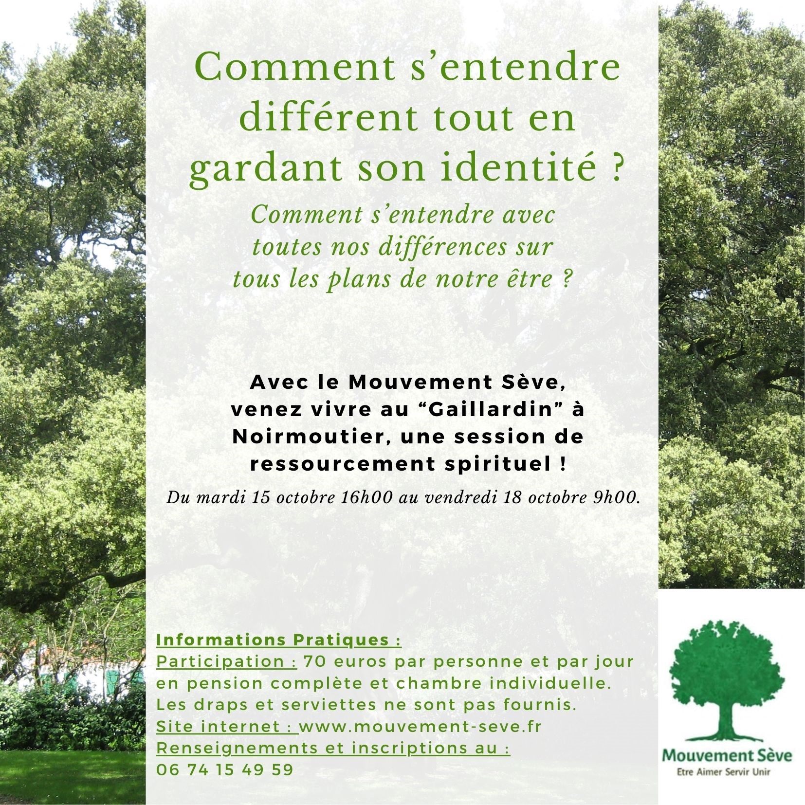 Du mardi 15 (16h) au vendredi 18 octobre 2024 (9h), avec le Mouvement Sève, venez vivre au « Gaillardin » à Noirmoutier, une session de ressourcement spirituel : « Comment s’entendre différent tout en gardant son identité ? ».