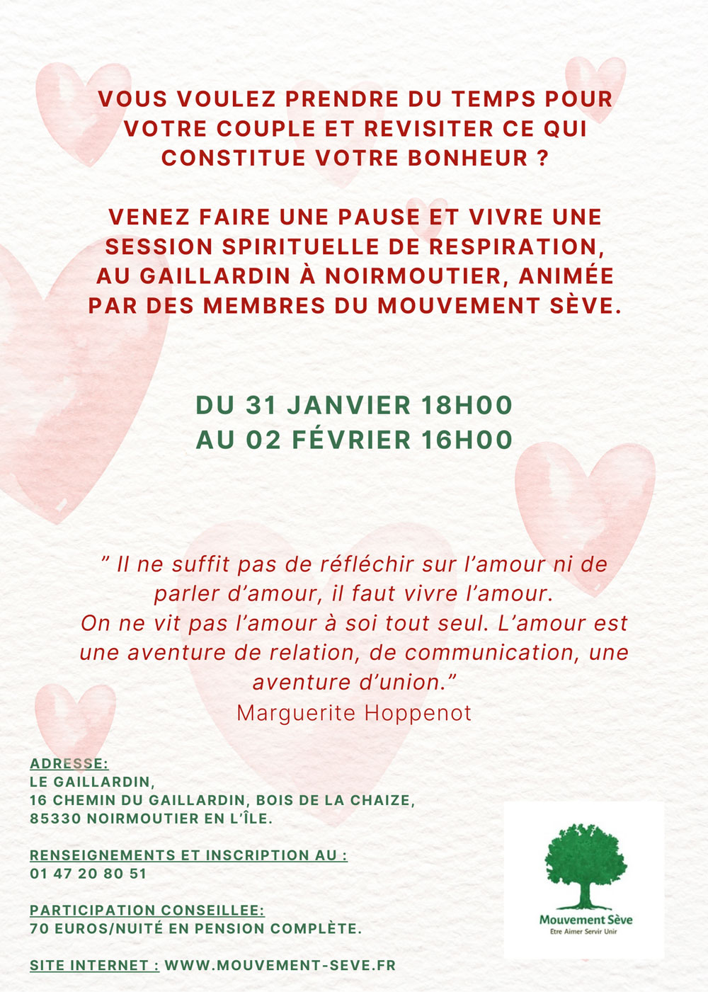 Le Mouvement Sève vous invite à une session spirituelle pour le couple pour prendre du temps pour lui et revisiter ce qui constitue votre bonheur du 31 janvier au 02 février 2025, à Noirmoutier.