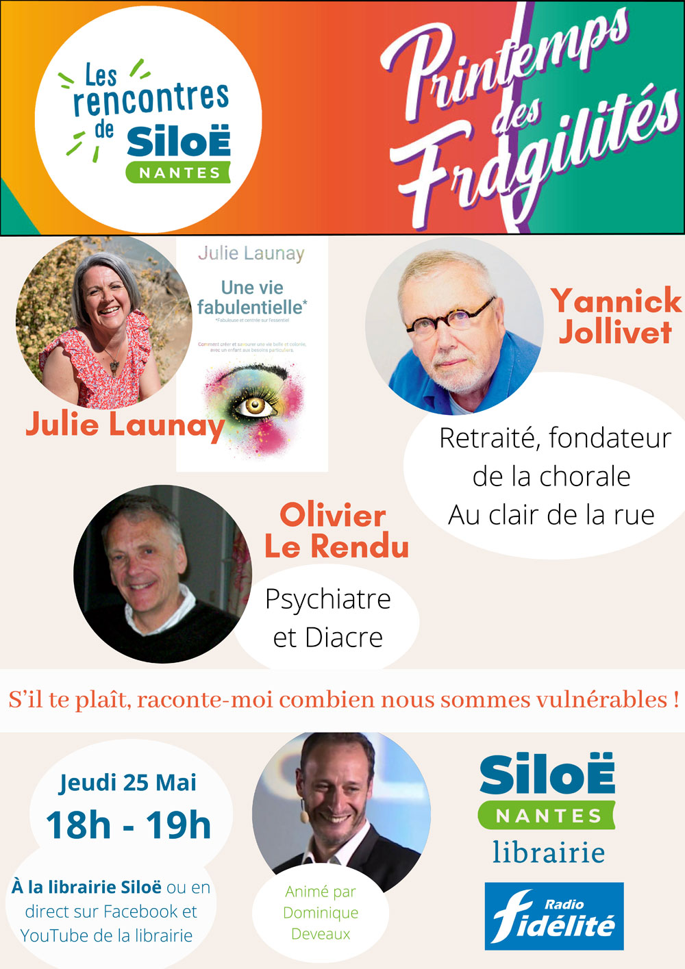 Dans le cadre du Printemps des Fragilités, la librairie Siloë et Radio fidélité vous invitent à une table ronde le jeudi 25 mai 2023 de 18h à 19h à la librairie cathédrale pour une table ronde animée par Dominique Deveaux.