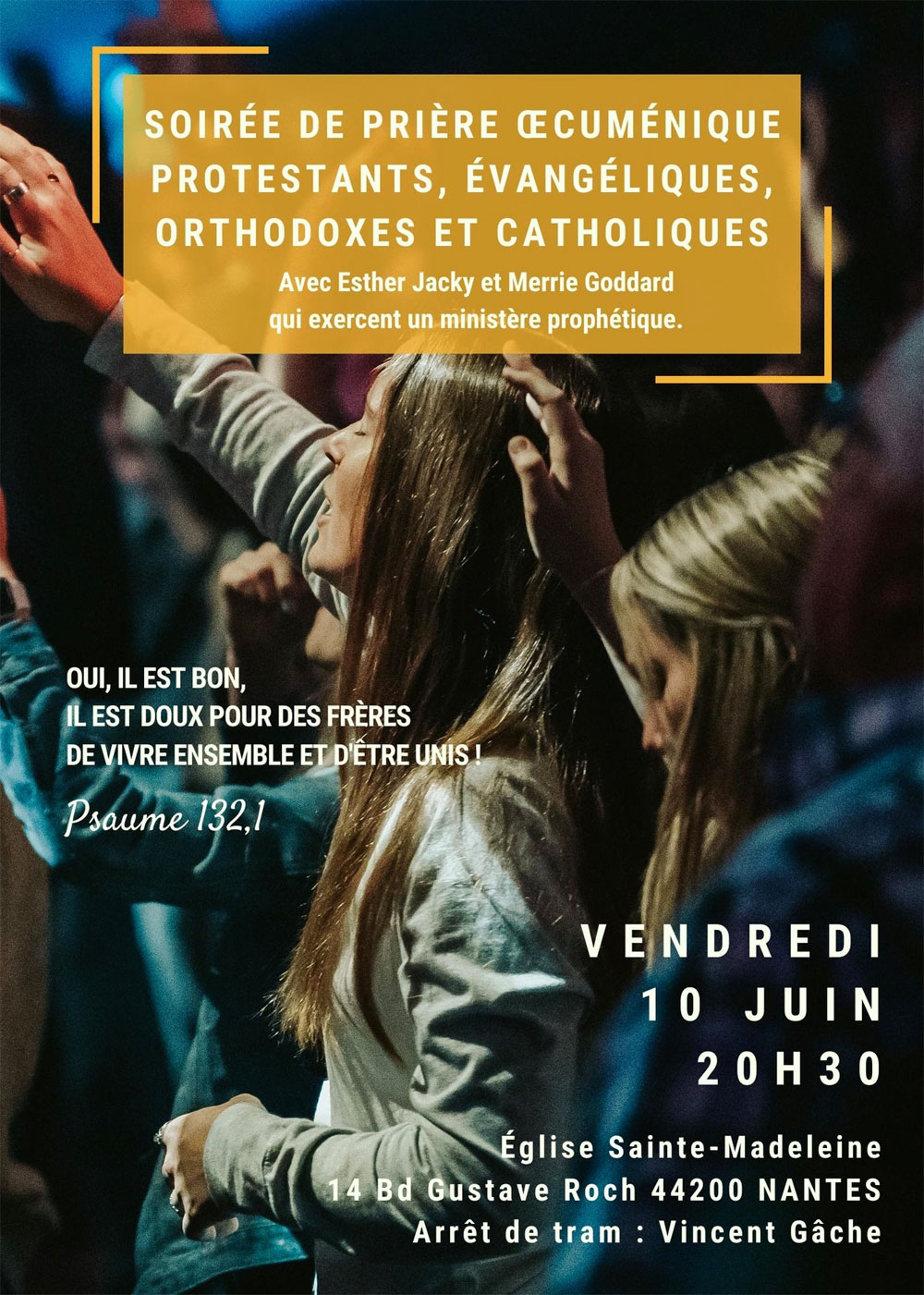 La paroisse Sainte-Madeleine de Nantes vous invite le vendredi 10 juin 2022 à 20h30 à une soirée de prière œcuménique protestants, évangéliques, orthodoxes et catholiques avec Esther Jacky et Merrie Goddard.
