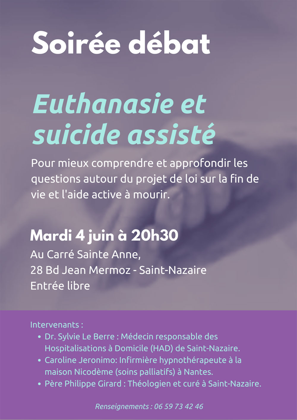 La paroisse Saint-Pierre-de-l’Océan propose une soirée débat sur la fin de vie « Euthanasie et suicide assisté » le mardi 4 juin 2024 à 20h30 au Carré Sainte Anne à Saint-Nazaire.