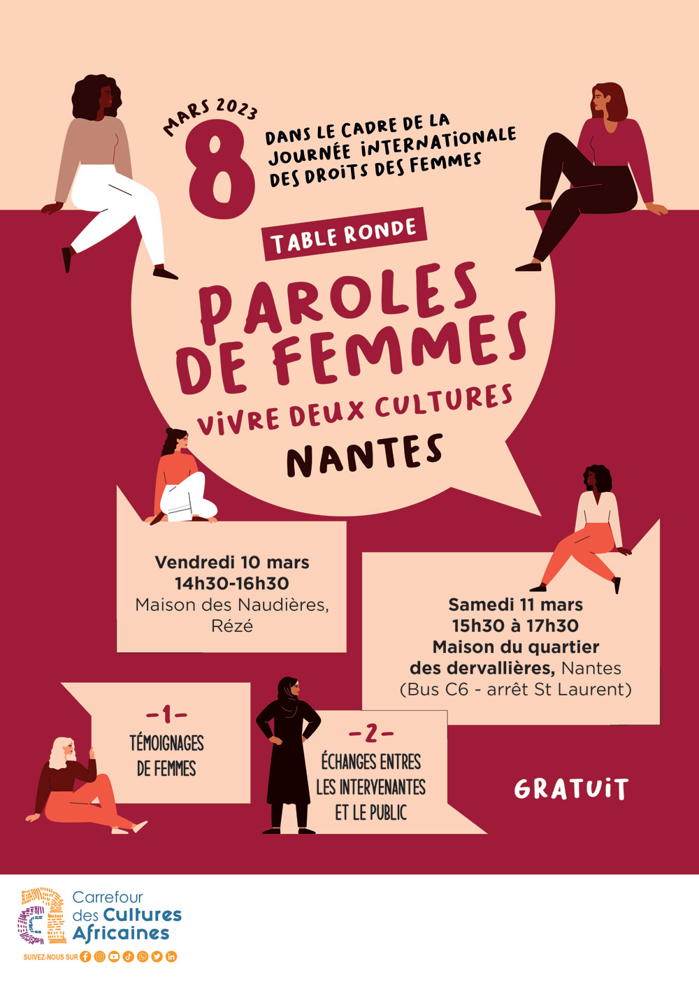 Dans le cadre de la Journée internationale des Droits des Femmes, le Carrefour des Cultures Africaines de Lyon, avec le concours des Missions Africaines, organise une table ronde d’une part le vendredi 10 mars 2023 à la maison SMA des Naudières (25 rue des Naudières – Rezé) de 14h30 à 16h30 et le samedi 11 mars 2023 à la Maison du Quartier des Dervallières  (place des Dervallières 44100 Nantes: bus ligne C6, station Saint Laurent).