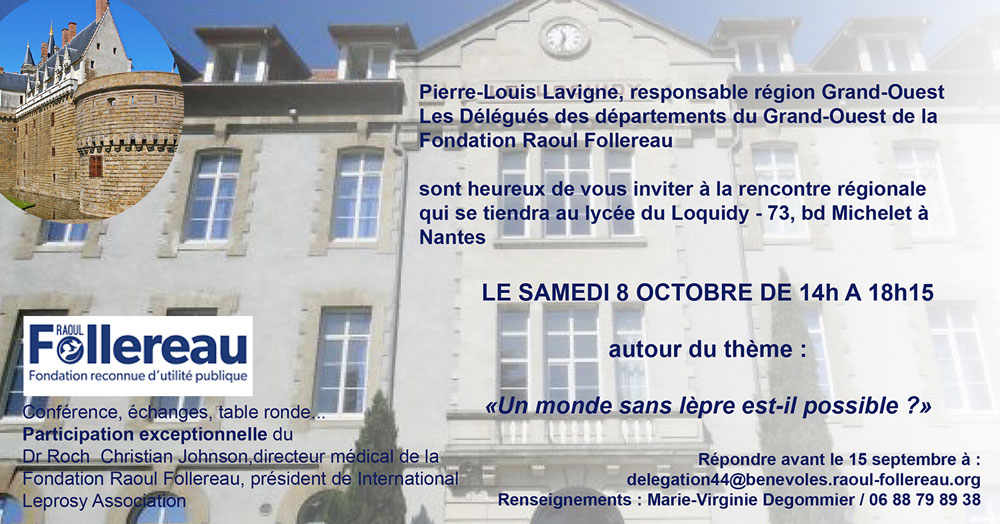 Le responsable régional Grand-Ouest, Pierre Louis Lavigne, et les délégués des départements du Grand Ouest de la Fondation Raoul Follereau vous invitent à la rencontre régionale au Collège-Lycée Loquidy autour du thème : « Un monde sans lèpre est-il possible ? ».