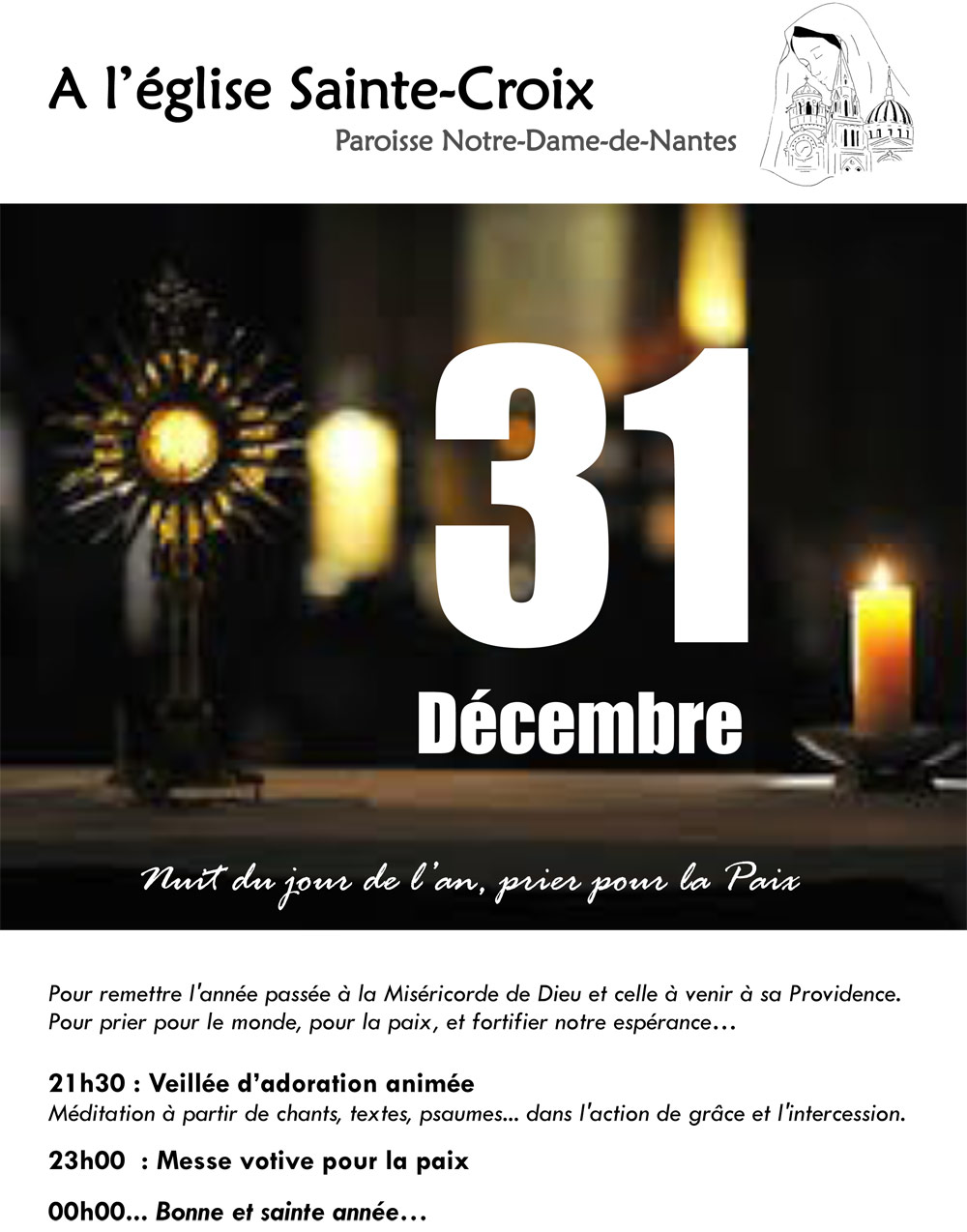 En ce dernier jour de l’année, une veillée d’adoration animée (21h30) suivie d’une messe votive pour la paix (23h00) aura lieu à l’église Sainte-Croix (paroisse Notre-Dame-de-Nantes).