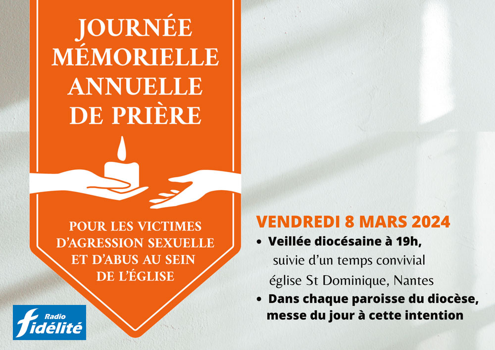 Vendredi 8 mars 2024, troisième vendredi de Carême, aura lieu la journée annuelle de mémoire et de prière pour les personnes victimes de violences sexuelles, d’abus de pouvoir et de conscience au sein de l’Église. Une célébration diocésaine aura lieu à 19h, à l’église Saint-Dominique à Nantes (retransmise sur Radio Fidélité). Ce sera une célébration de la Parole, ouverte à tous, préparée par des membres de la cellule d’accueil et d’écoute, une victime, le service de liturgie et d’autres services. Ensemble, nous demanderons au Christ qu’il répande sa grâce sur les membres de son corps blessé.