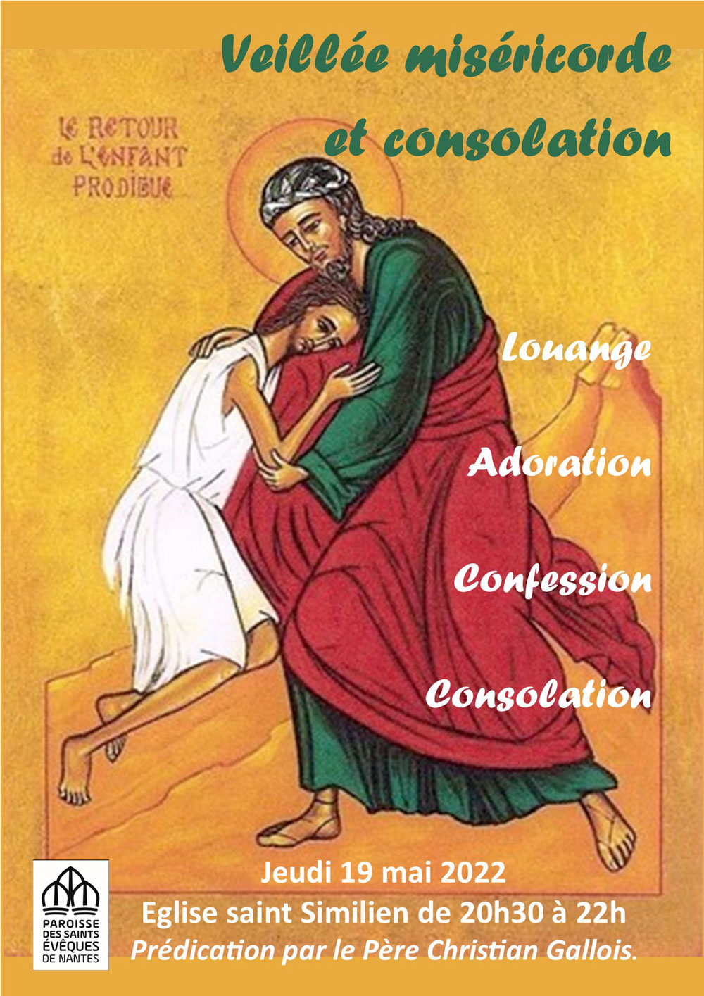 Jeudi 19 mai 2022 de 20h30 à 22h, veillée miséricorde et consolation en l’église Saint-Similien de Nantes (paroisse des Saints-Évêques-de-Nantes) avec prédication par le père Christian Gallois, curé de la paroisse.