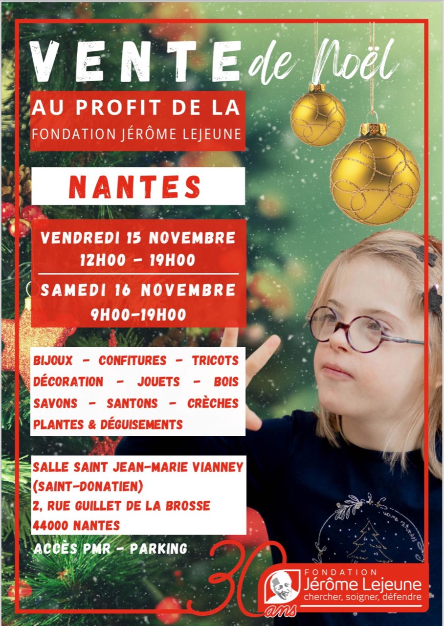 La Fondation Jérôme Lejeune (recherche et soins pour la trisomie 21 et autres déficiences intellectuelles génétiques) organise une vente de Noël à la salle Saint Jean-Marie Vianney (Saint-Donatien) (2 rue Guillet de la Brosse – 44000 Nantes)