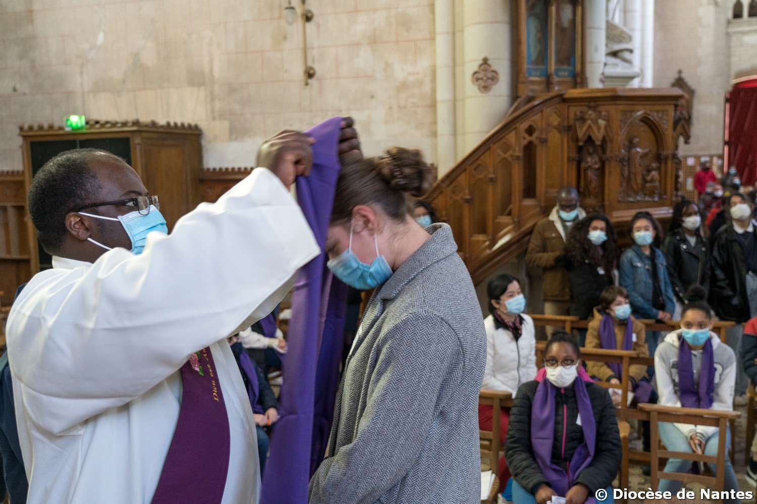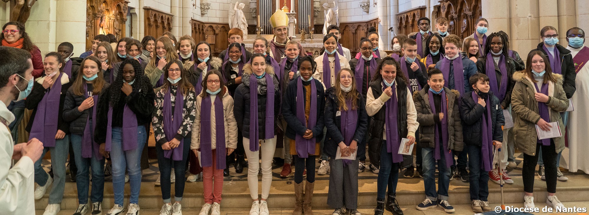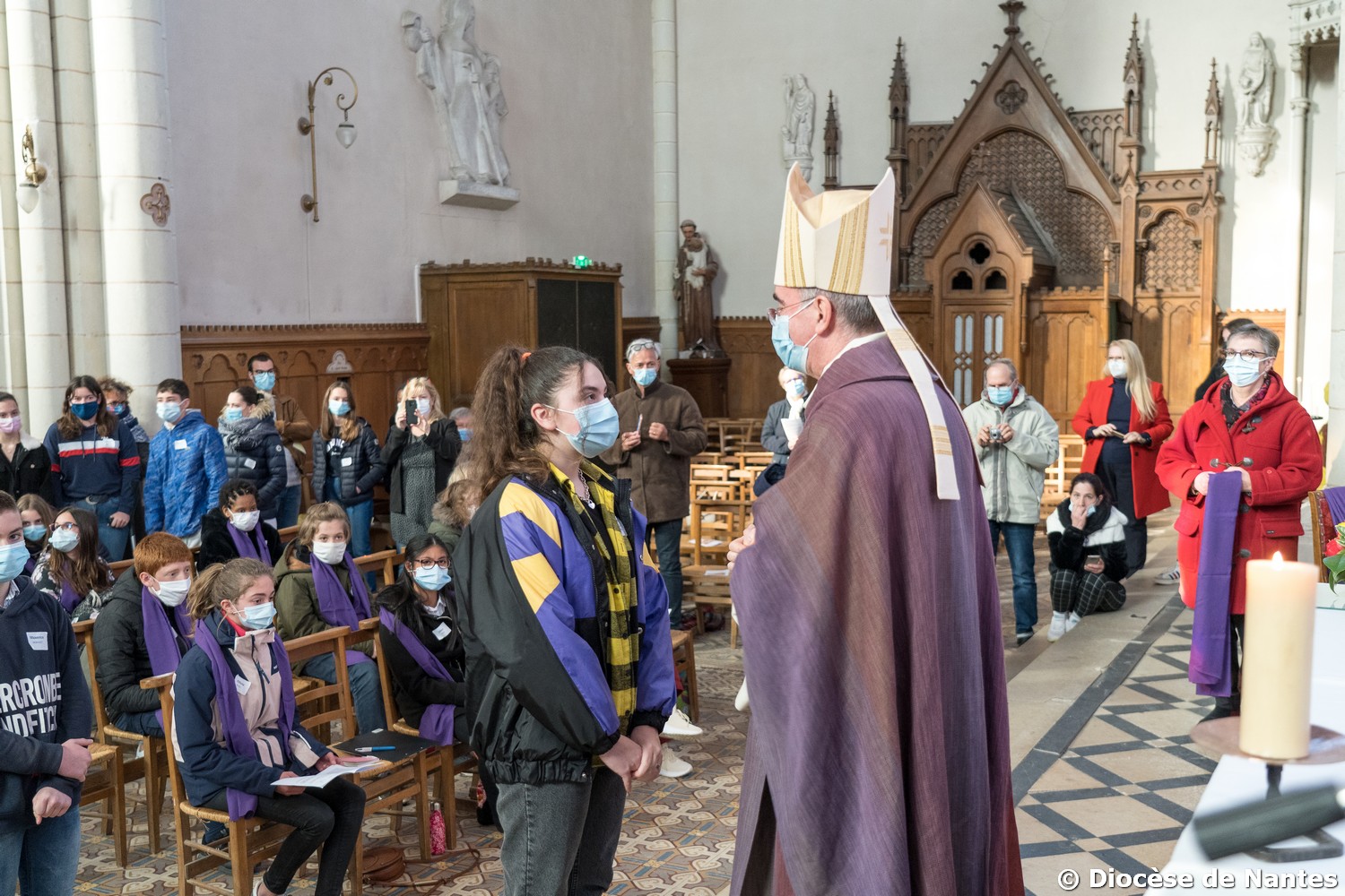 Au cours de la célébration, chaque jeune s’est avancé à l’appel de son prénom pour un court temps de dialogue avec Mgr Laurent Percerou, puis, revêtu d’une écharpe violette, est venu signer le registre qui sera confié à la prière des Clarisses de Nantes. Leur baptême sera célébré dans les paroisses à Pâques ou dans le temps pascal.