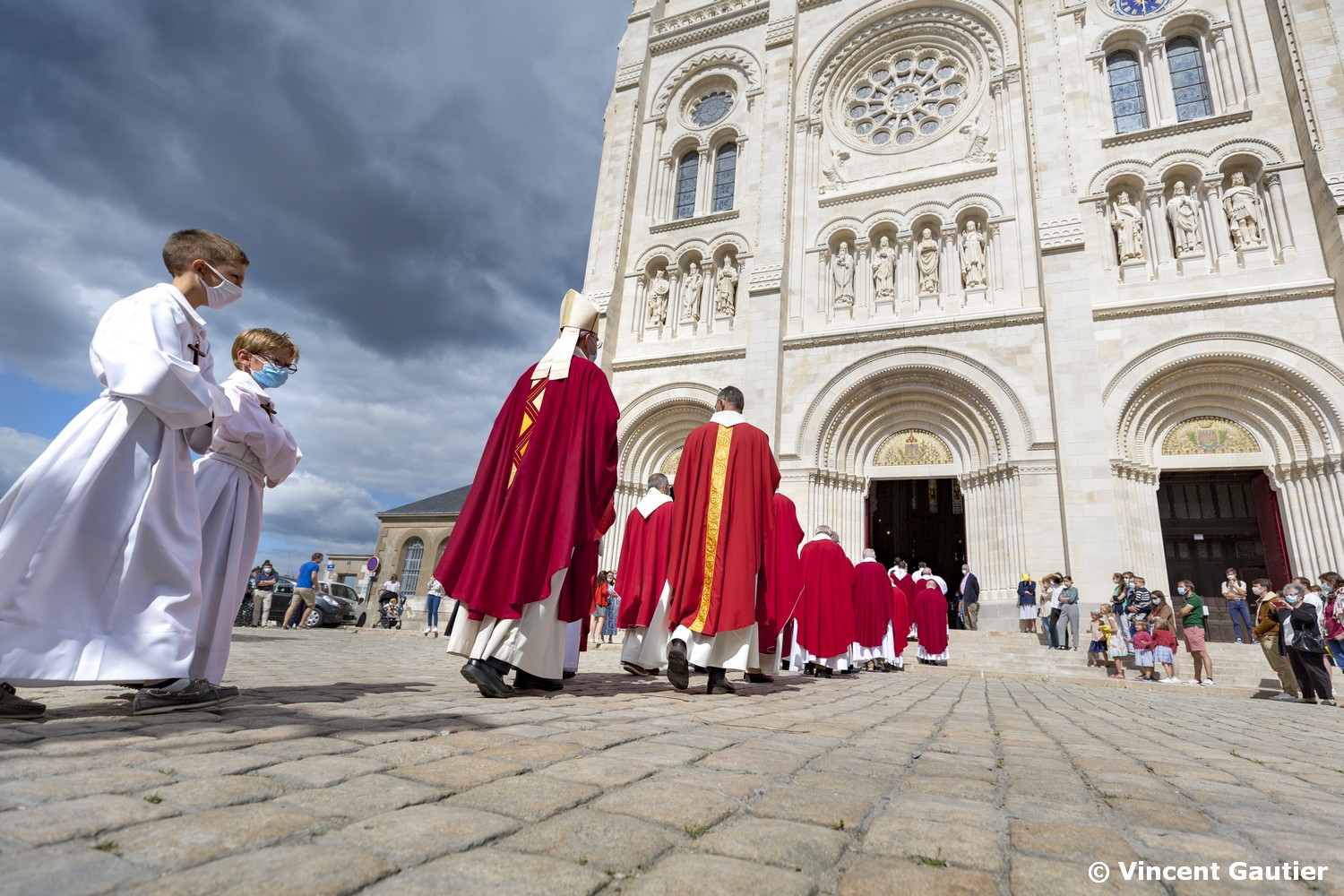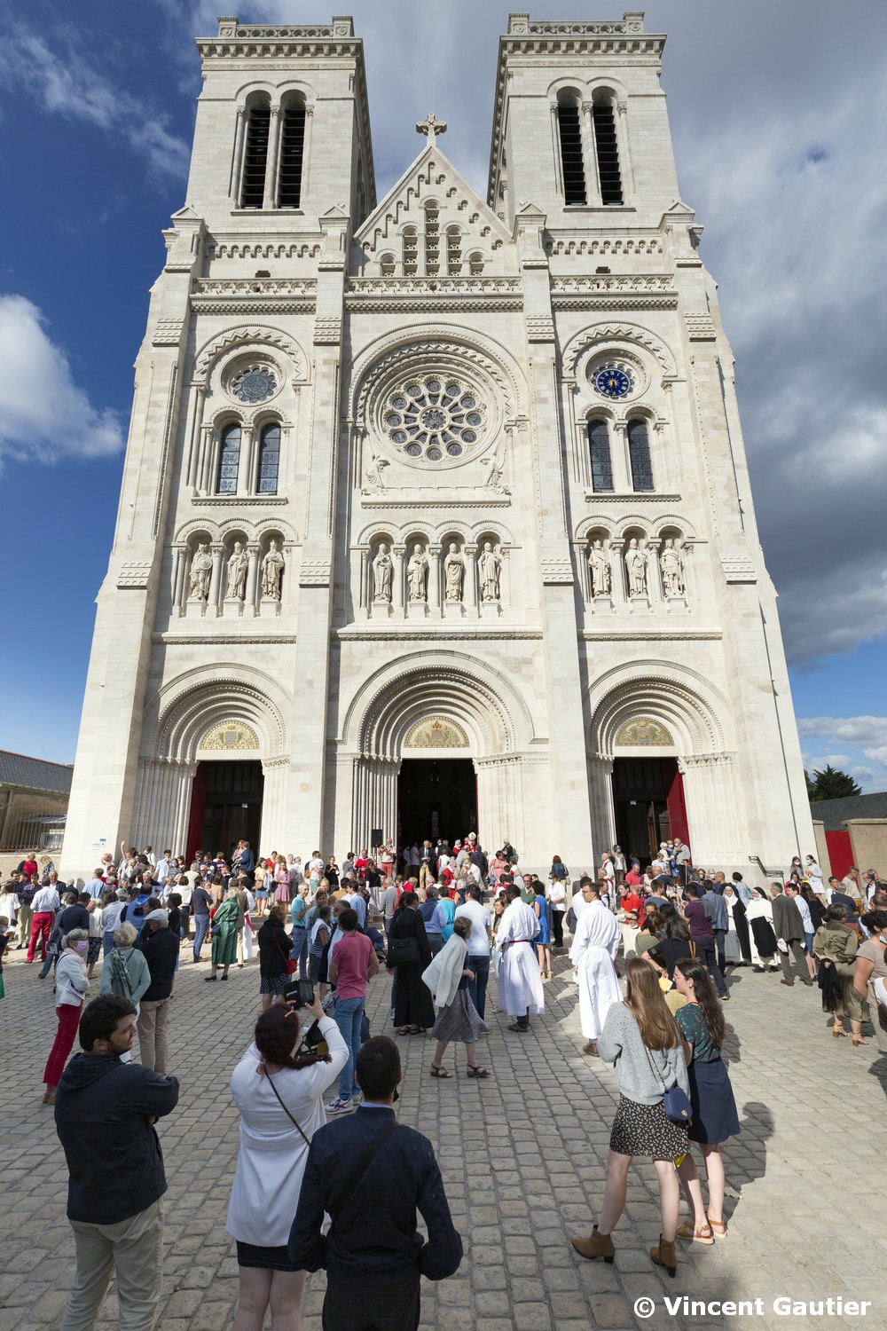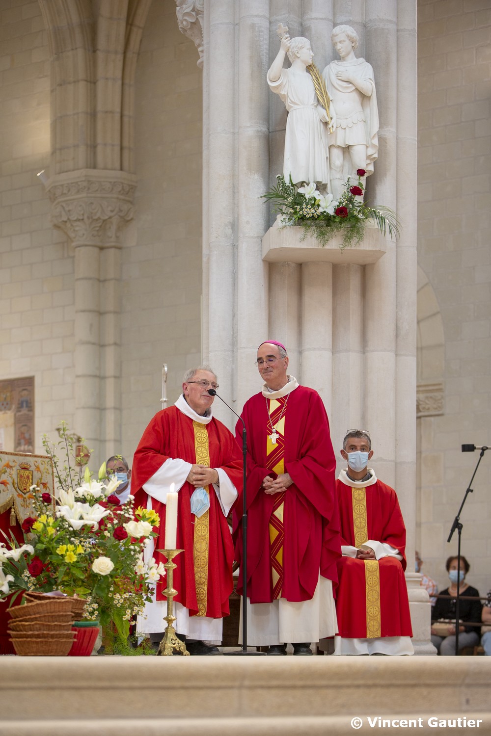 D’emblée, l’évêque de Nantes a ainsi résumé le cœur de la célébration : « nos bâtiments de pierre sont comme le symbole de ce qu’est notre Eglise. Lorsque nous contemplons cette basilique si magnifiquement restaurée, nous ne pouvons pas, nous autres disciples du Christ, ne pas penser que nous sommes appelés à être cette Église ouverte, rayonnante, solide, attirante et lumineuse ! En priant saints Donatien et Rogatien cet après-midi, nous nous souvenons qu’à leur suite nous sommes invités à devenir martyrs, c’est-à-dire à donner notre vie par amour de nos frères, au risque des épreuves et des tourments. »