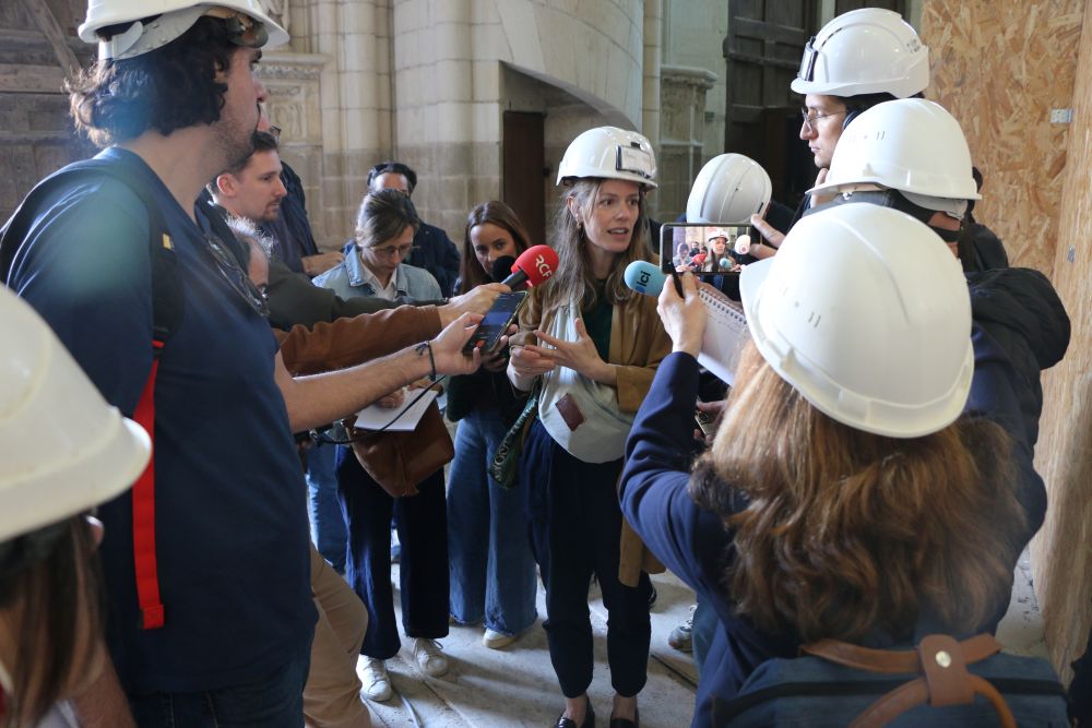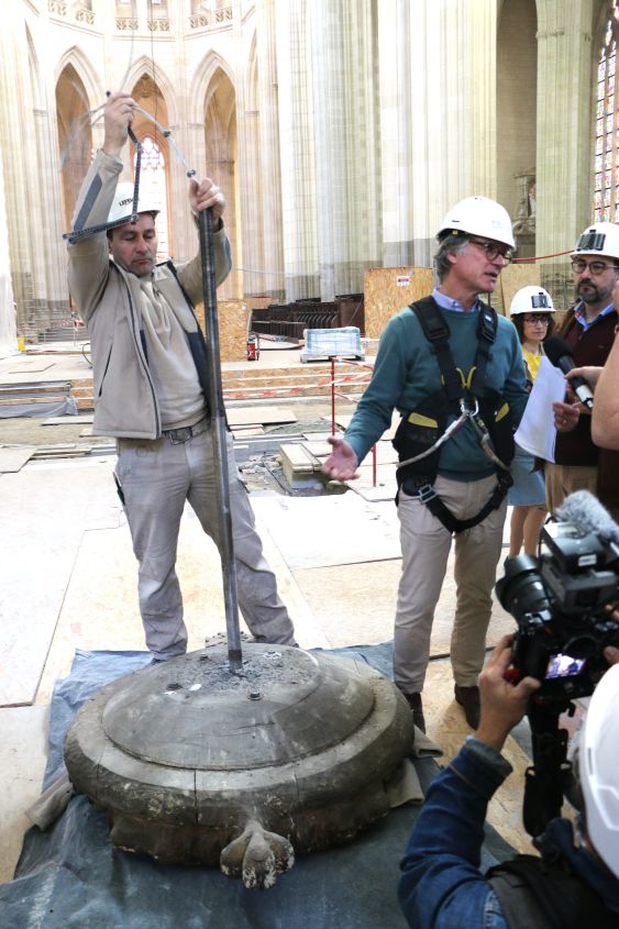 Presque cinq ans après l’incendie de la cathédrale de Nantes, une visite de chantier était organisée pour les journalistes, ce mercredi 14 mai 2025. Un point d’étape que la Direction Régionale des Affaires Culturelles a voulu partager avec les journalistes en leur permettant d’assister à la dépose de la dernière des quatre pièces décoratives situées à la croisée des voûtes de la nef.