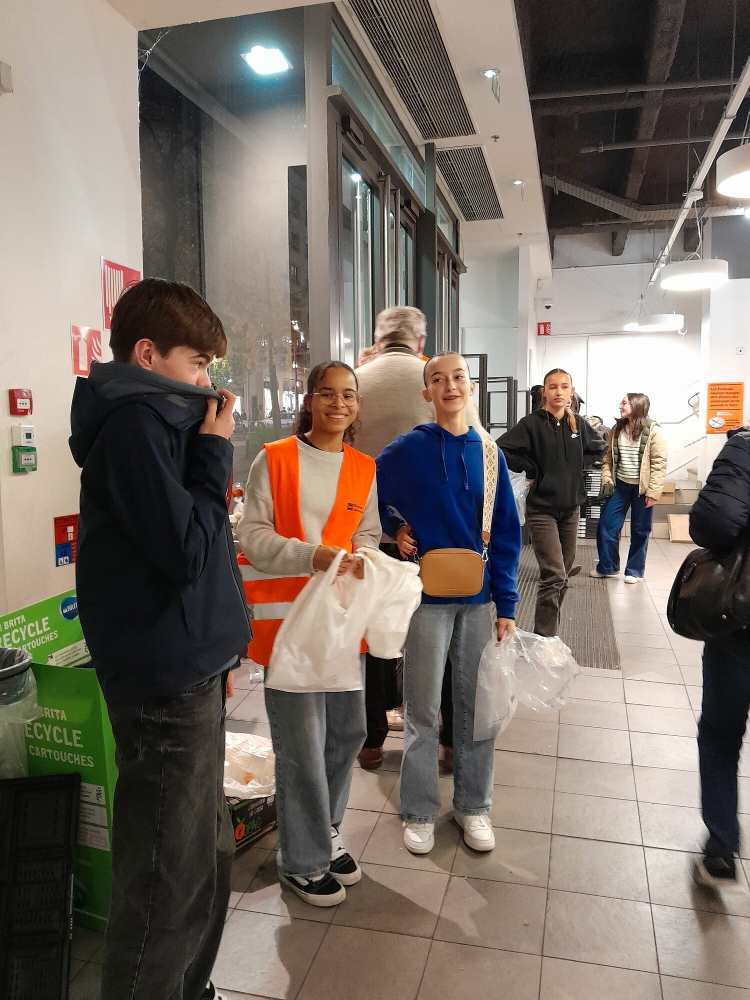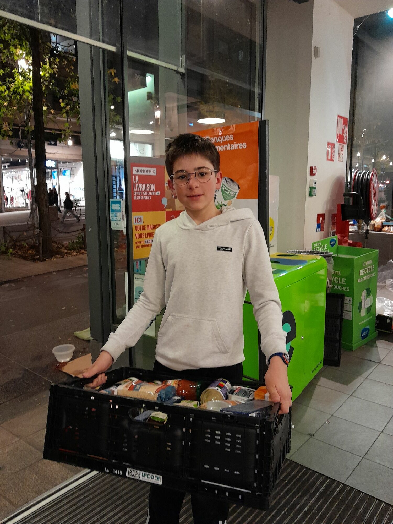 Vendredi 23 novembre, les jeunes collégiens de l’Aumônerie de l’Enseignement Public de Nantes-centre ont participé avec entrain à la collecte de denrées alimentaires. Les jeunes ont pu toucher du doigt la générosité de tous, ils étaient heureux d’expliquer le concept des dons, de ranger et de porter des centaines de kilos de denrées alimentaires dans le camion sous l’œil bienveillant des bénévoles de la conférence St Vincent du Paul. Très touchés de recevoir des chocolats « pour les bénévoles » pour les encourager dans leur élan de solidarité !