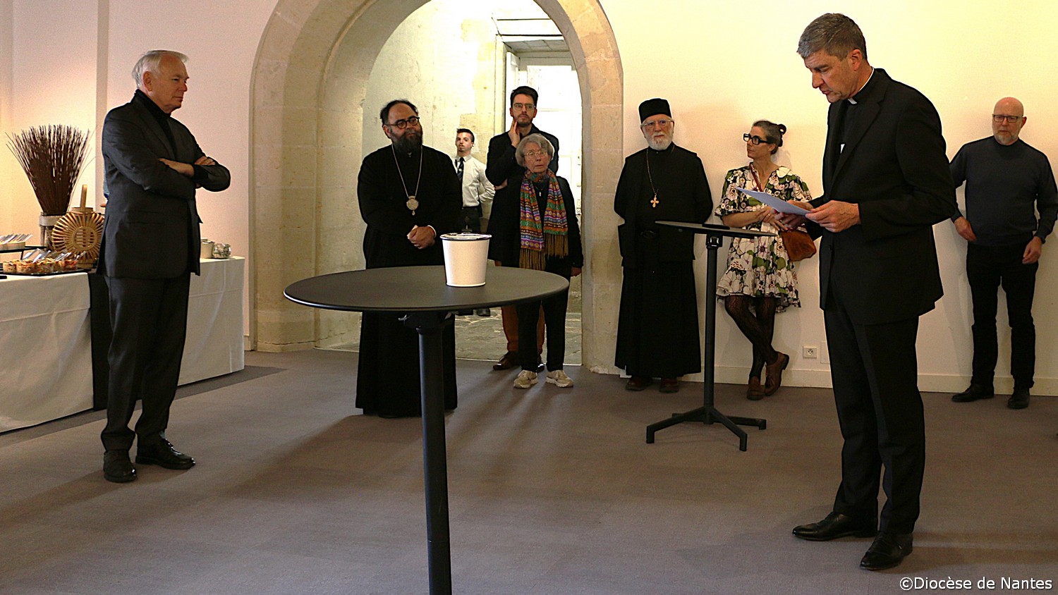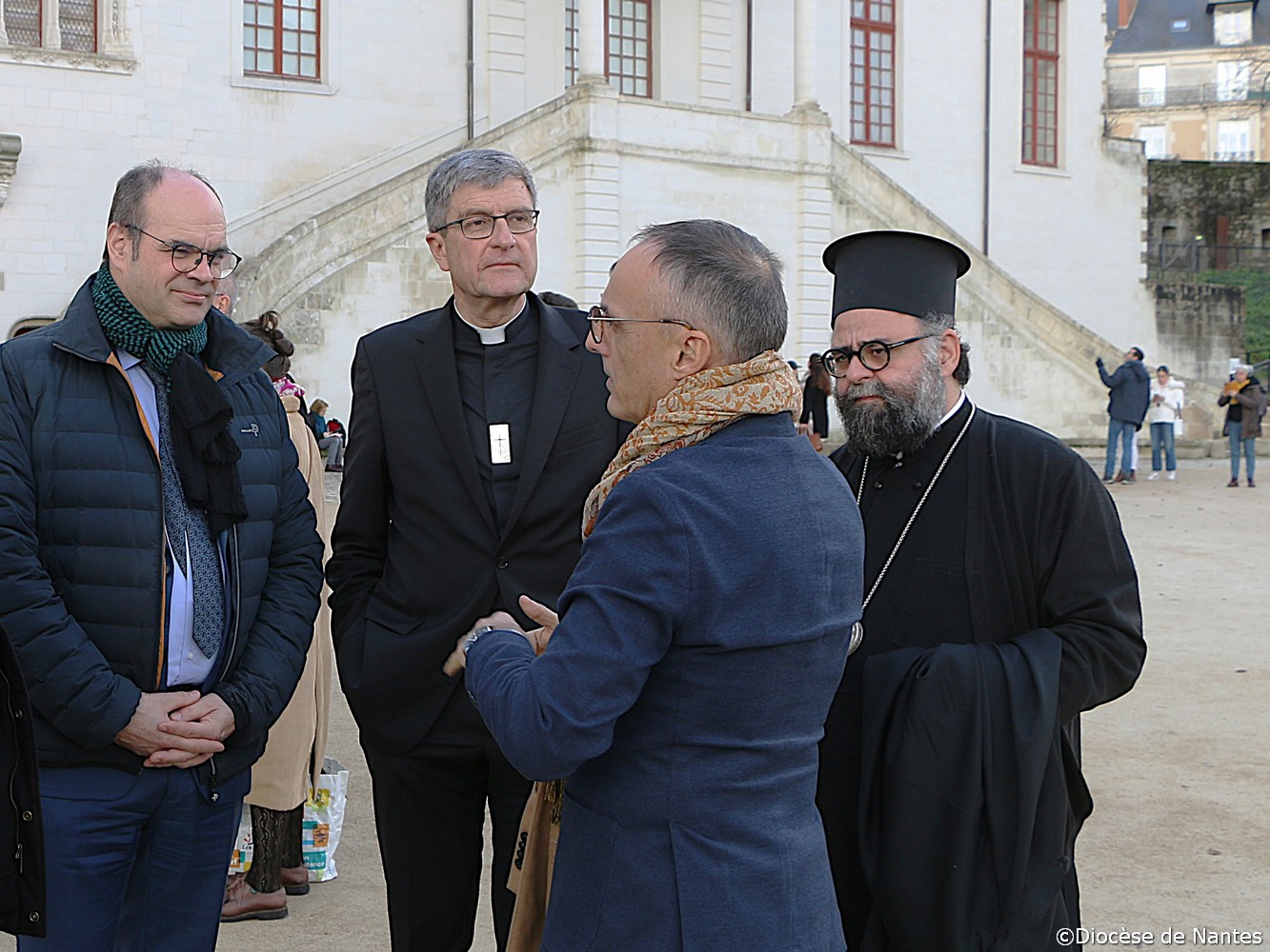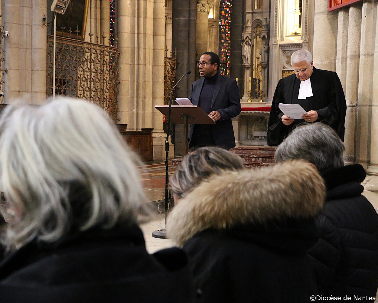 Ils ont été accueillis par Mgr Percerou, évêque de Nantes : « C’était hier : les monuments, les mémoires, les bords de la Loire gardent des traces de ce passé, de cette pente tentatrice pour l’être humain d’entrer en connivence pour disposer d’autrui comme d’un objet ! Nos Eglises rassemblées aujourd’hui souhaitent redire avec force, au nom du Christ, leur engagement contre l’esclavage, celui du passé dont il faut faire mémoire, mais aussi contre celui qui subsiste aujourd’hui, ici et ailleurs, sous toute forme connue ou souterraine, et toujours inacceptable. »